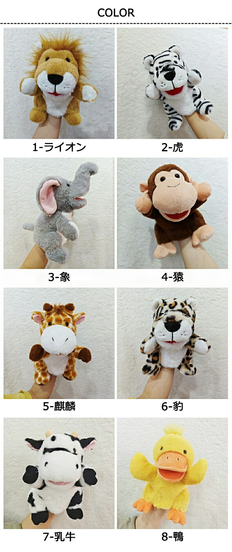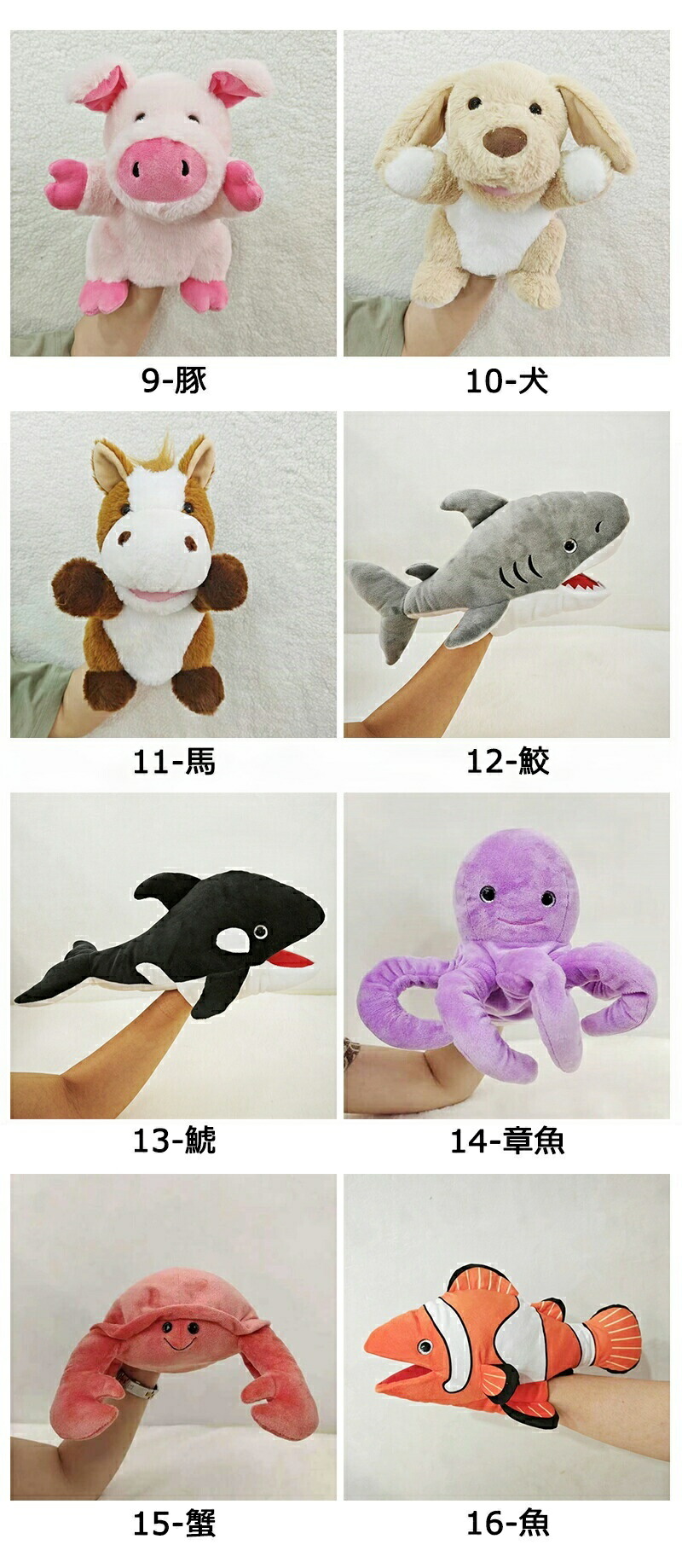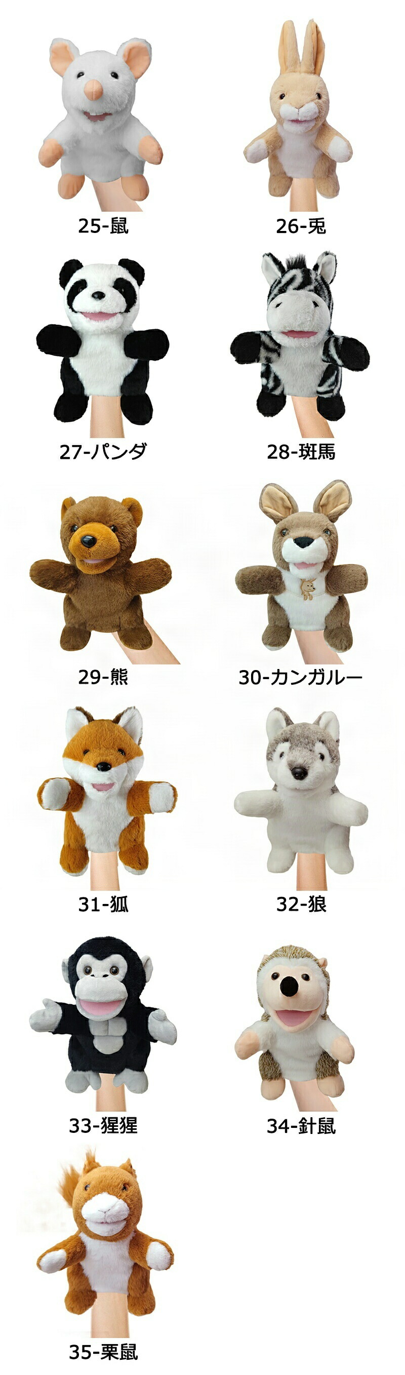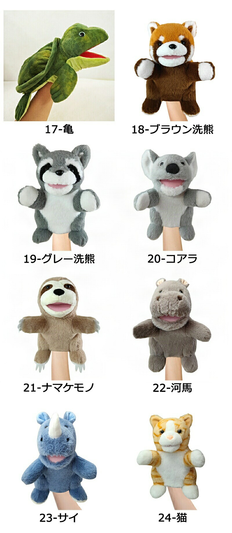 ハンドパペット ぬいぐるみ 開口 口が おもちゃ ぬいぐるみ 早い者勝ち 1-ライオン 2-虎 3-象 4-猿 5-麒麟 6-豹 7-乳牛 8-鴨 9-豚 10-犬 11-馬 12-鮫 13-鯱 14-章魚 15-蟹 16-魚 17-亀 18-ブラウン洗熊 19-グレー洗熊 20-コアラ 21-ナマケモノ 22-河馬 23-サイ 24-猫 25-鼠 26-兎 27-パンダ 28-斑馬 29-熊 30-カンガルー 31-狐 32-狼 33-猩猩 34-針鼠 35-栗鼠