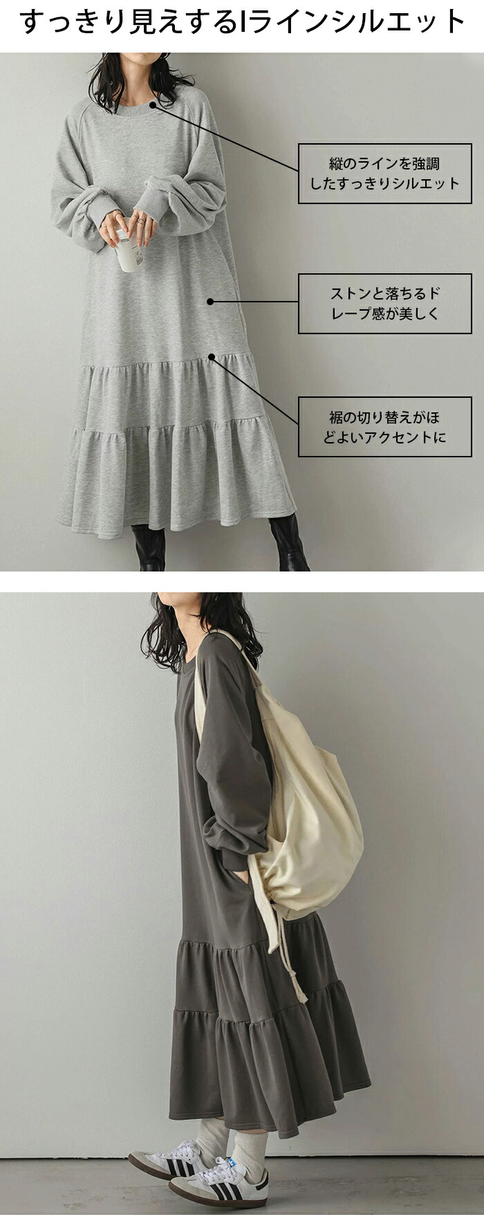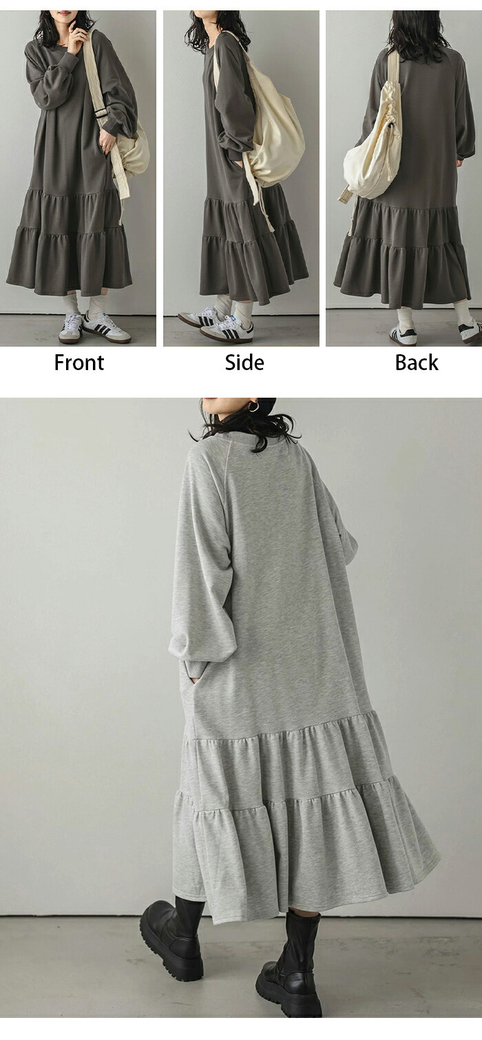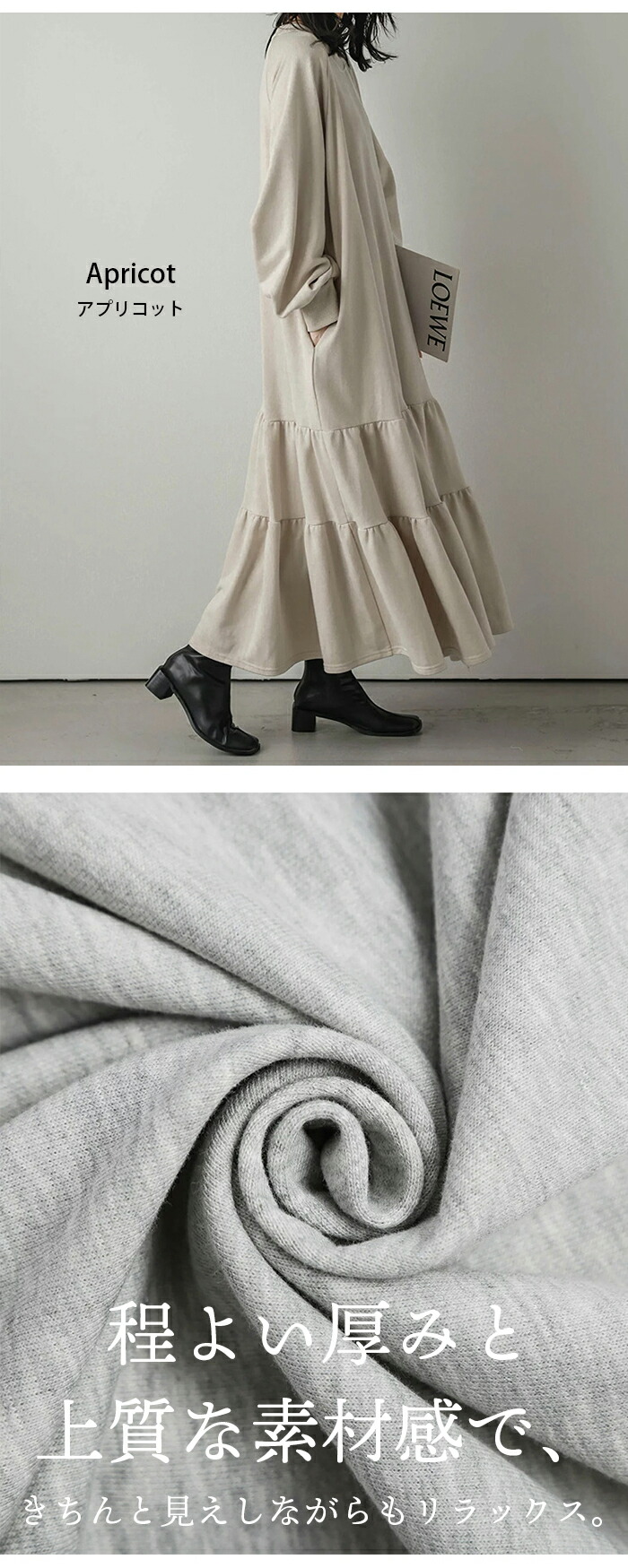 シンプルで着回しやすいロング丈のスウェット素材のティアードワンピースです。ゆったりとしたシルエットで体型カバーを叶えつつ、女性らしいやわらかな雰囲気を演出します。リラックス感のあるデザインで、デイリーコーデからお出かけまで幅広く活躍。着るだけで自然と着痩せ効果が期待できるのも嬉しいポイントです。