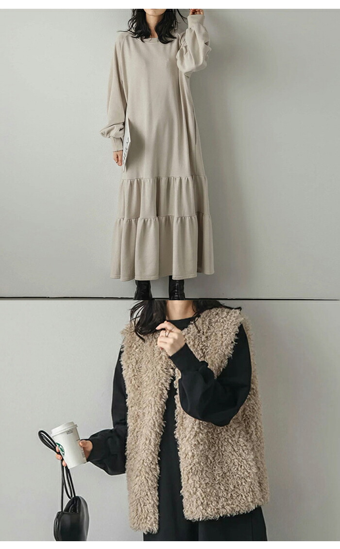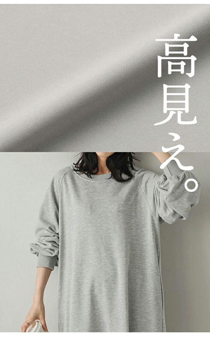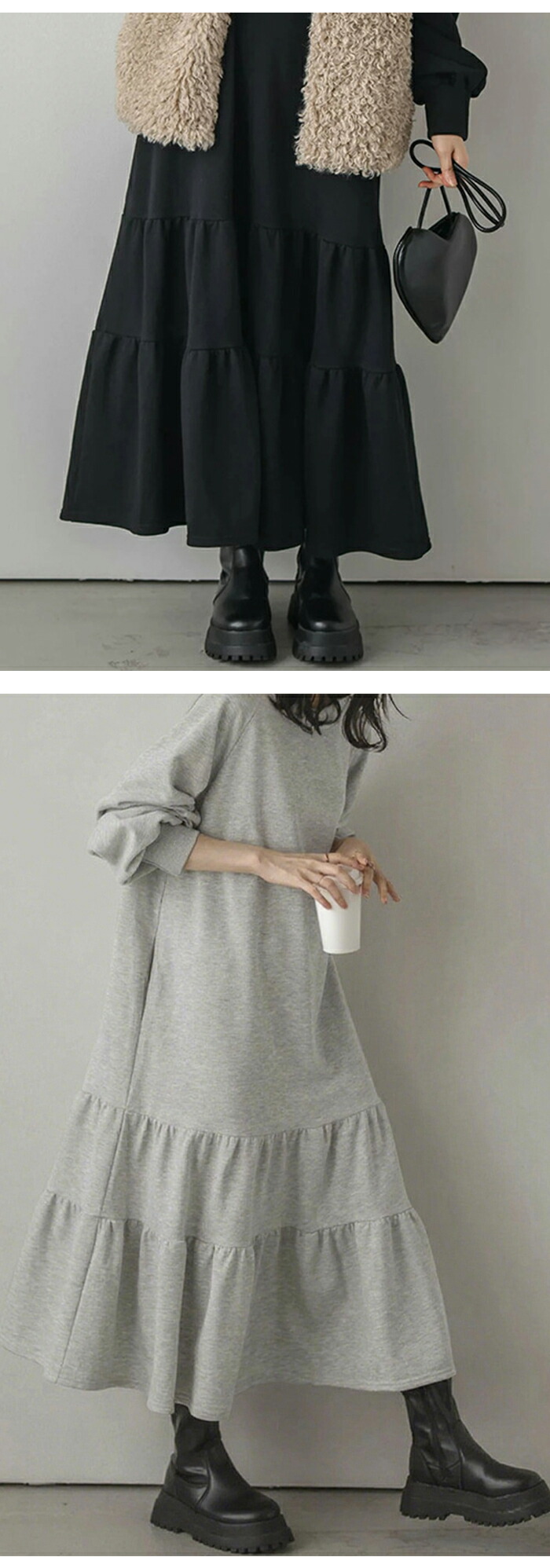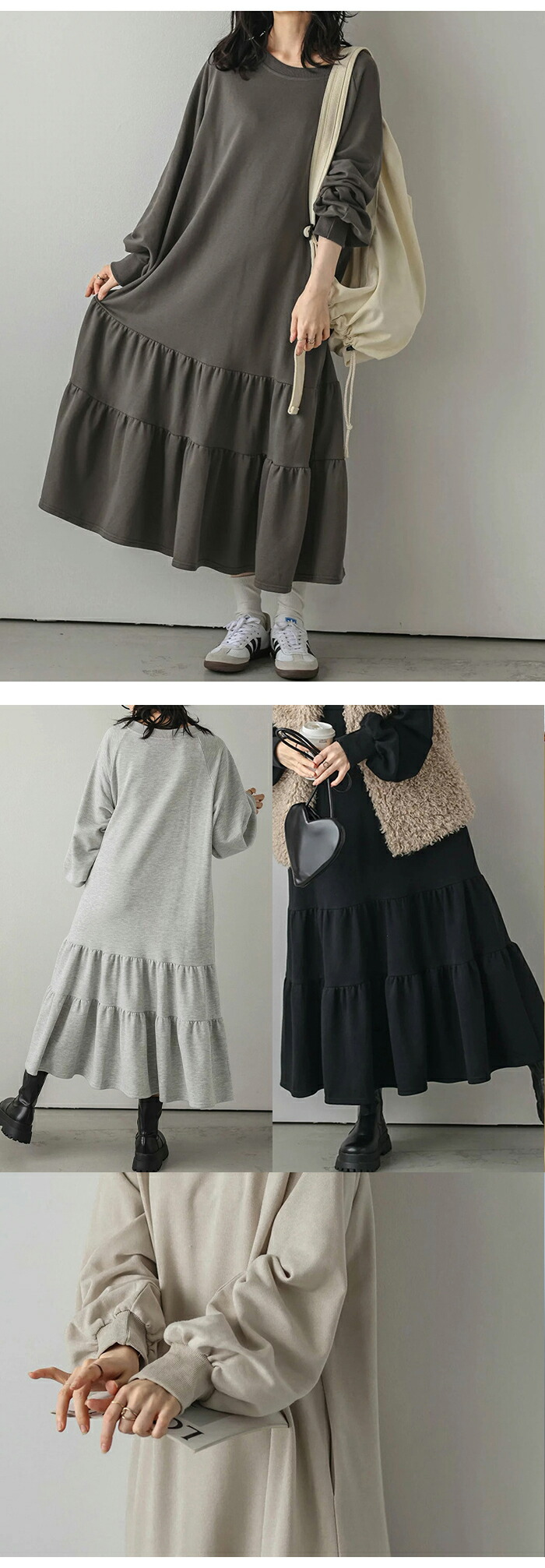 シンプルで着回しやすいロング丈のスウェット素材のティアードワンピースです。ゆったりとしたシルエットで体型カバーを叶えつつ、女性らしいやわらかな雰囲気を演出します。リラックス感のあるデザインで、デイリーコーデからお出かけまで幅広く活躍。着るだけで自然と着痩せ効果が期待できるのも嬉しいポイントです。