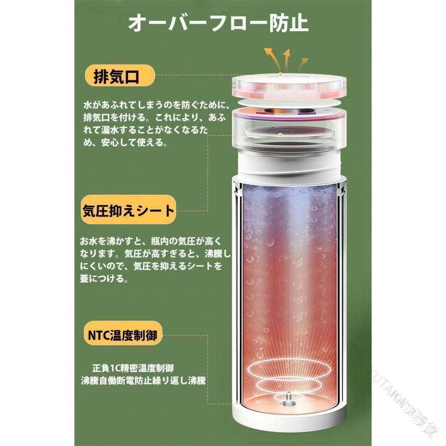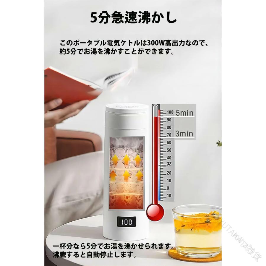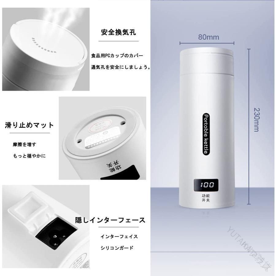 【重量】520g【容量】500ML【サイズ】直径80mm 高さ:230mm【5分急速沸かし】このポータブル電気ケトルは300W高出力なので、約5分でお湯を沸かすことができます。【空だき防止機能】一杯分なら5分でお湯を沸かせられます。沸騰すると自動停止します。【4段温度調整】本体の表面下にデジタル表示パネルがあり、温度も確認調整しやすい仕様です。ワンボタンだから、調整操作がとても簡単!起動後、ボタンをタッチして、温度を選択して、その後は待つだけ!【防漏設計】360°漏れ防止設計で、バッグ内の水漏れを心配する必要はありません注意事項商品写真はできる限り実物の色に近づけるよう加工しておりますが、お客様のお使いのモニター設定、お部屋の照明等により実際の商品と色味が異なる場合がございます。サイズは平置き手採寸サイズとなりますので測り方により誤差が出る場合がございます。±1cm前後の誤差が生じている場合がございますが、不良対象となりませんのでご了承ください。