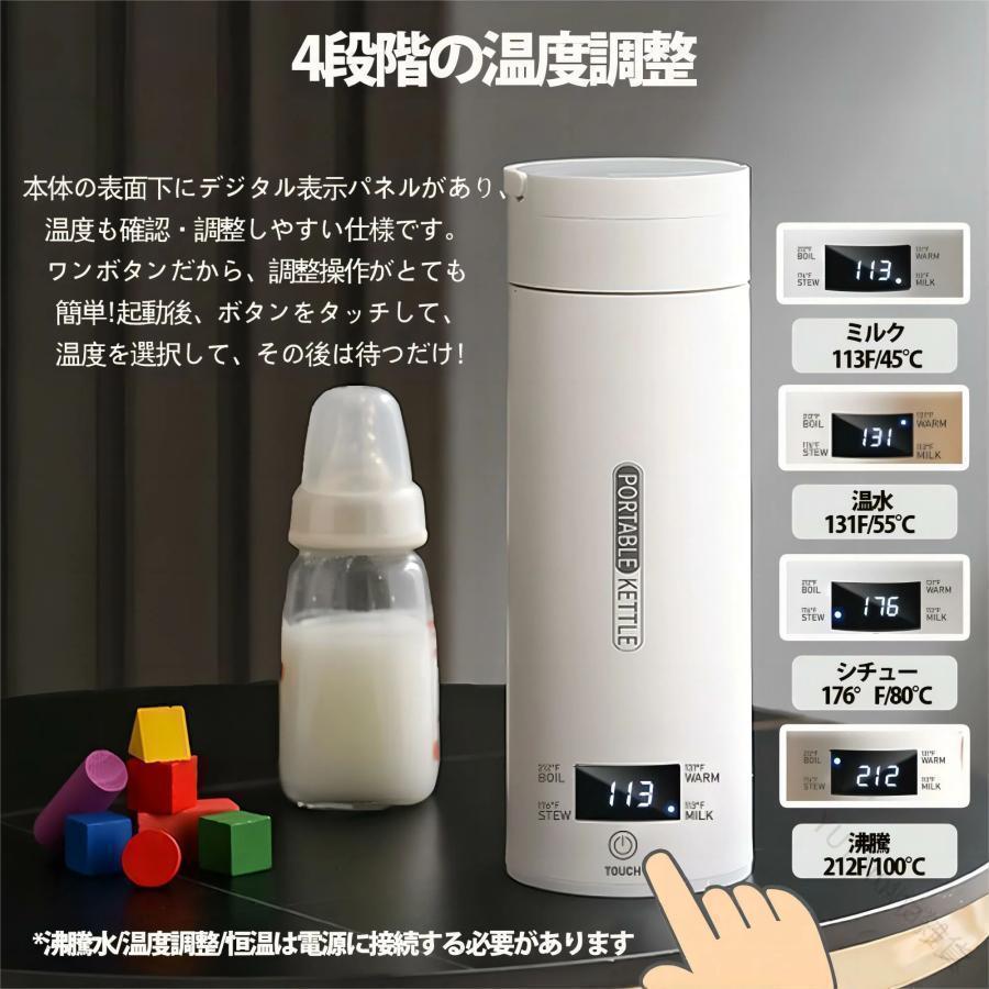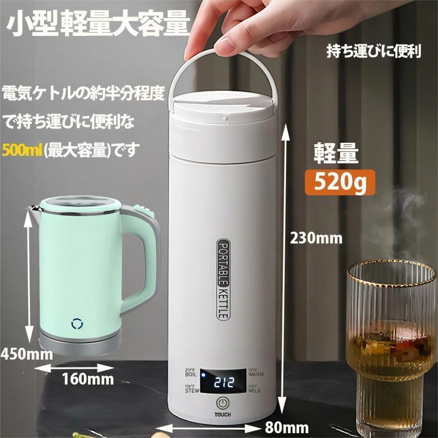 ポータブル電気ケトル 電気水筒 電気ケトル 電気ポット 500ml 小型 ミニ 電気ボトル 魔法瓶ポット 保温瓶 コンパクトサイズ ポータブルケトル 4段階温度設定 アウトドア キャンプ クリ 大容量