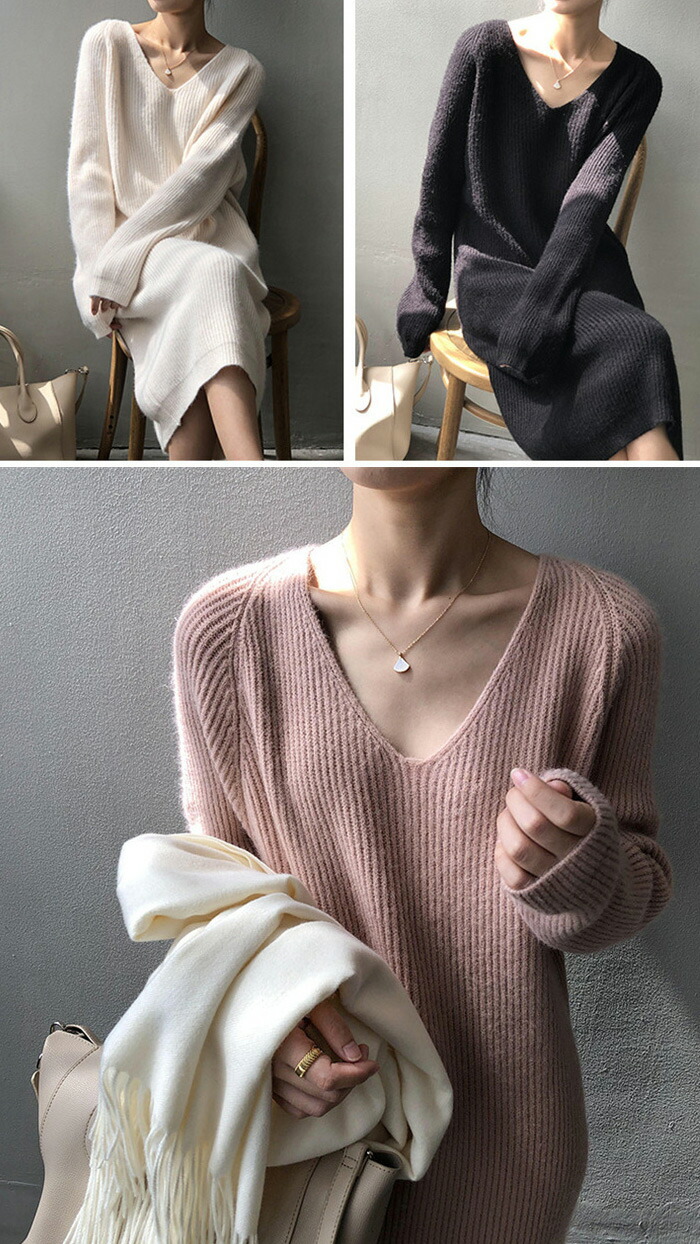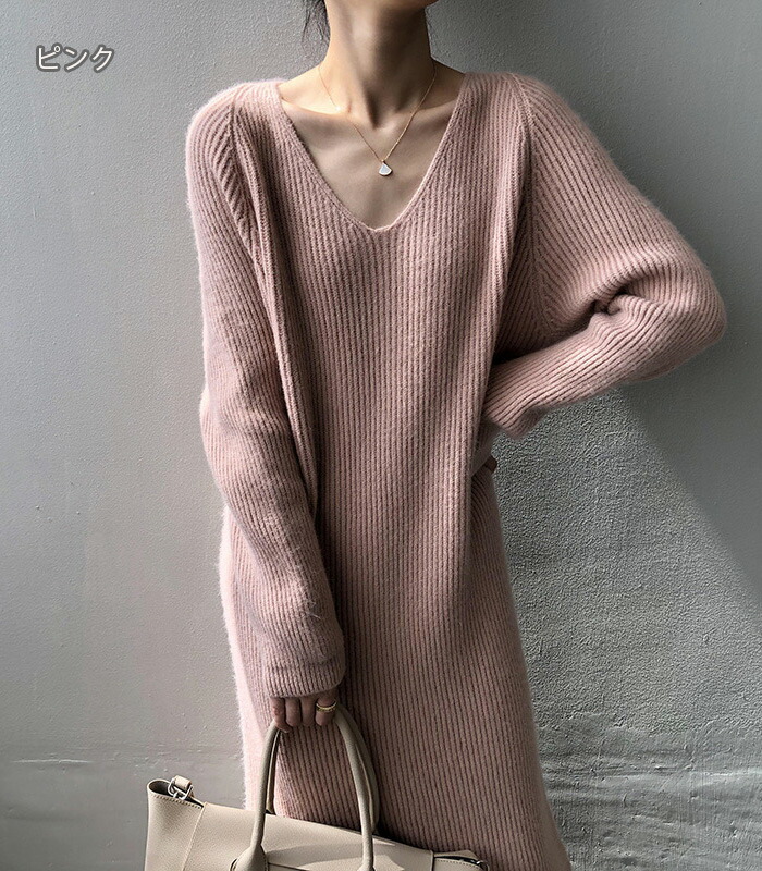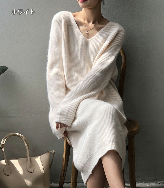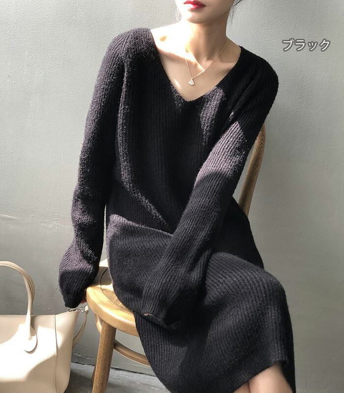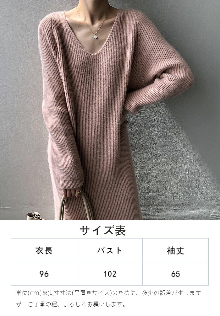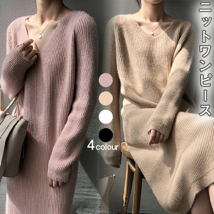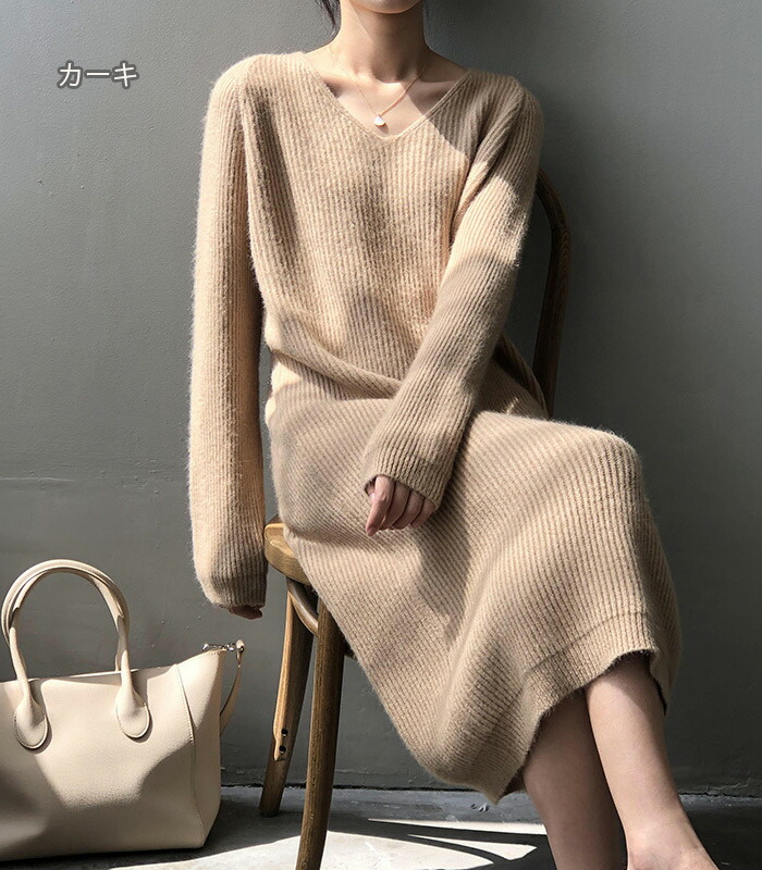 ニットワンピース ロング vネック 秋 ワンピース 超目玉商品 カーキ ピンク ブラック ホワイト