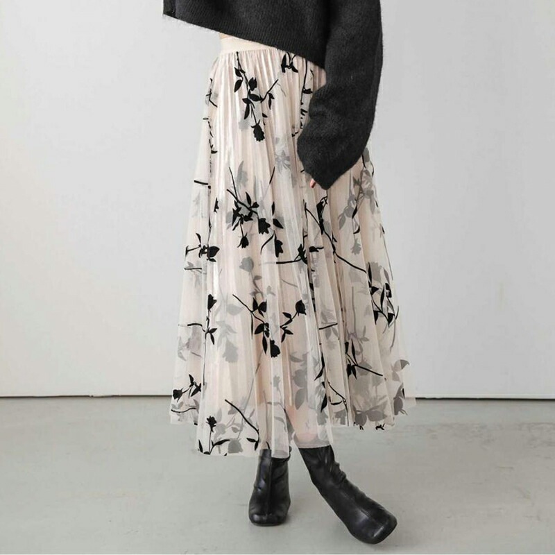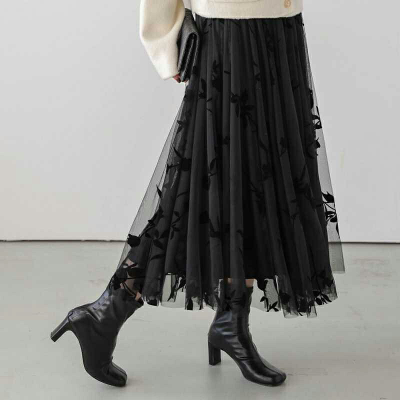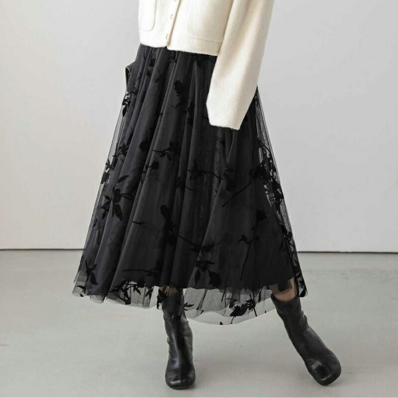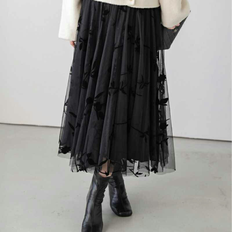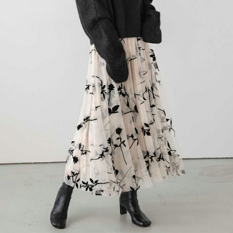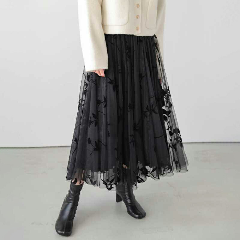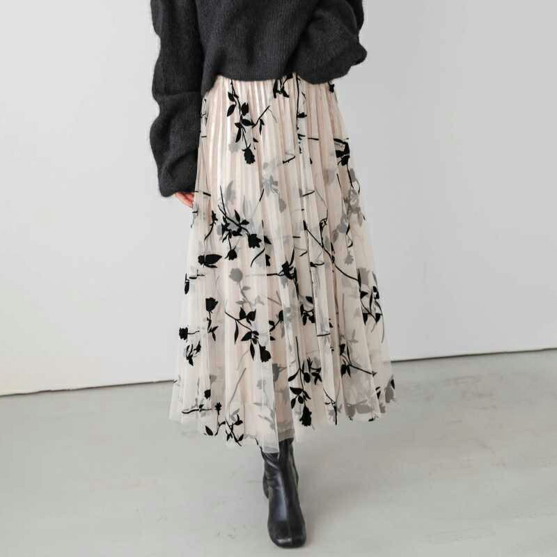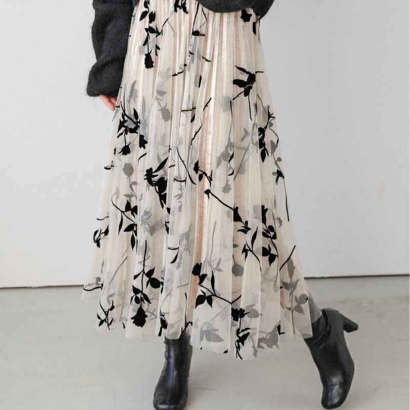 新作 フラワーベロア ロングスカート レディースファッション 通販 アプリコット地 フリ ブラック地 フリ