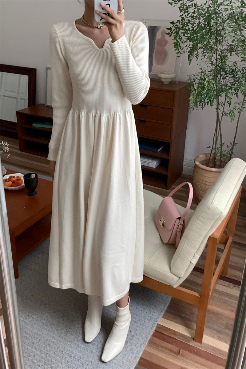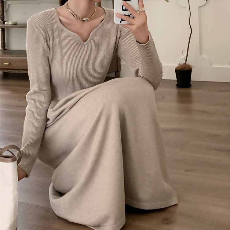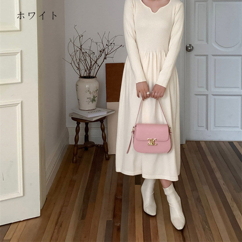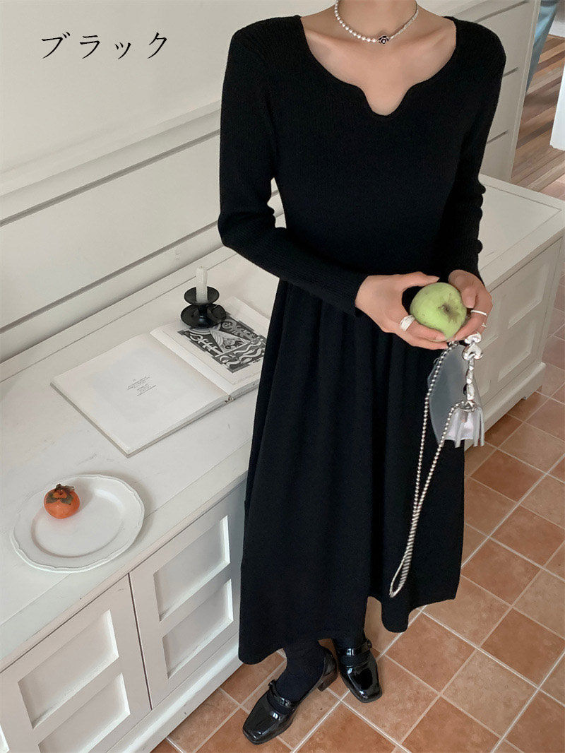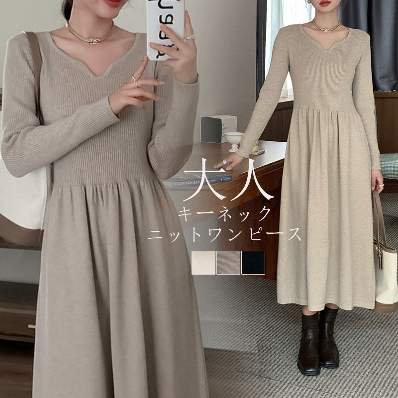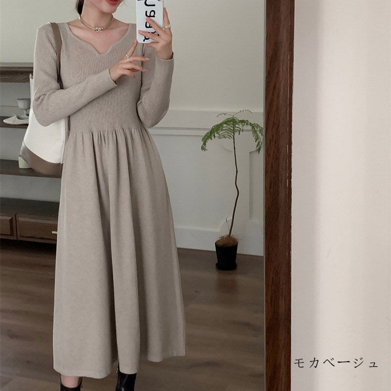 ニットワンピース ロング Vネック ワ レディースファッション 続々登場 モカベージュ ホワイト ブラック