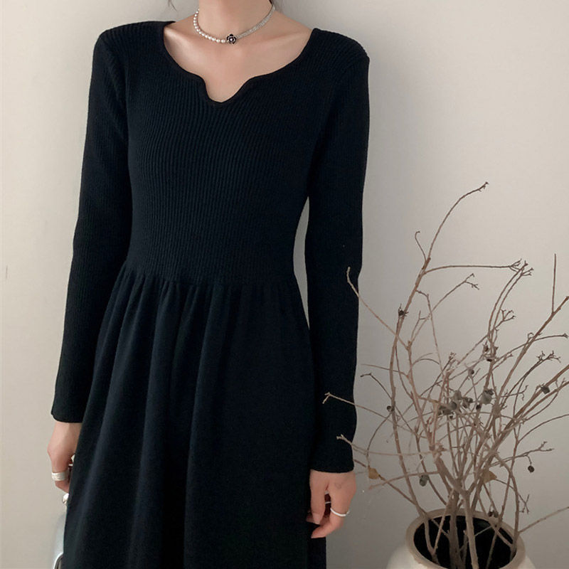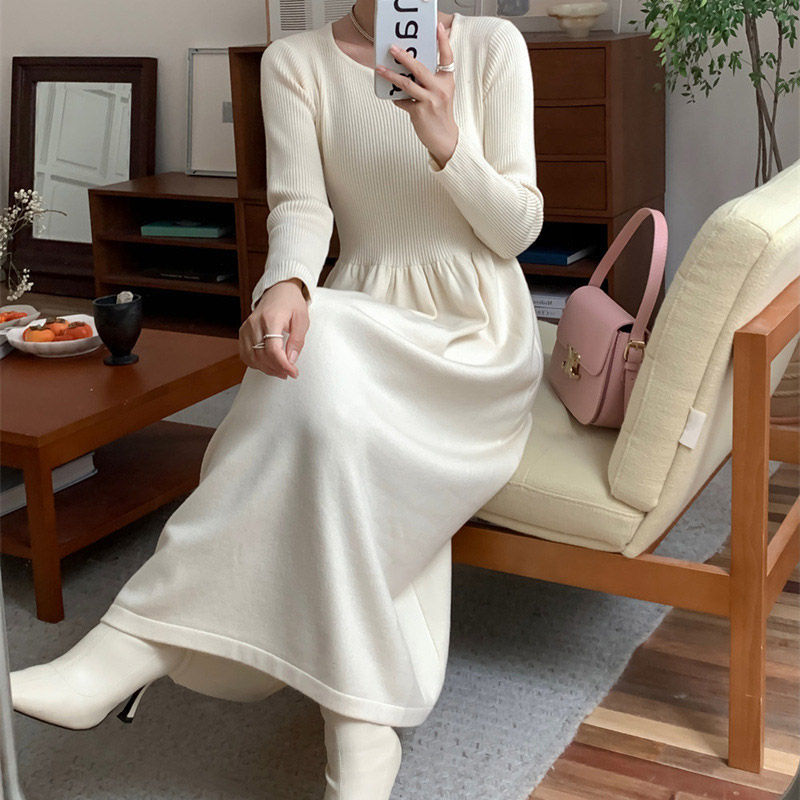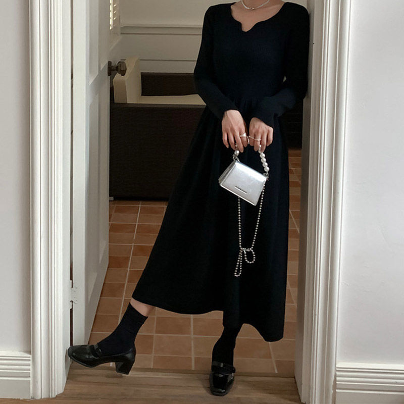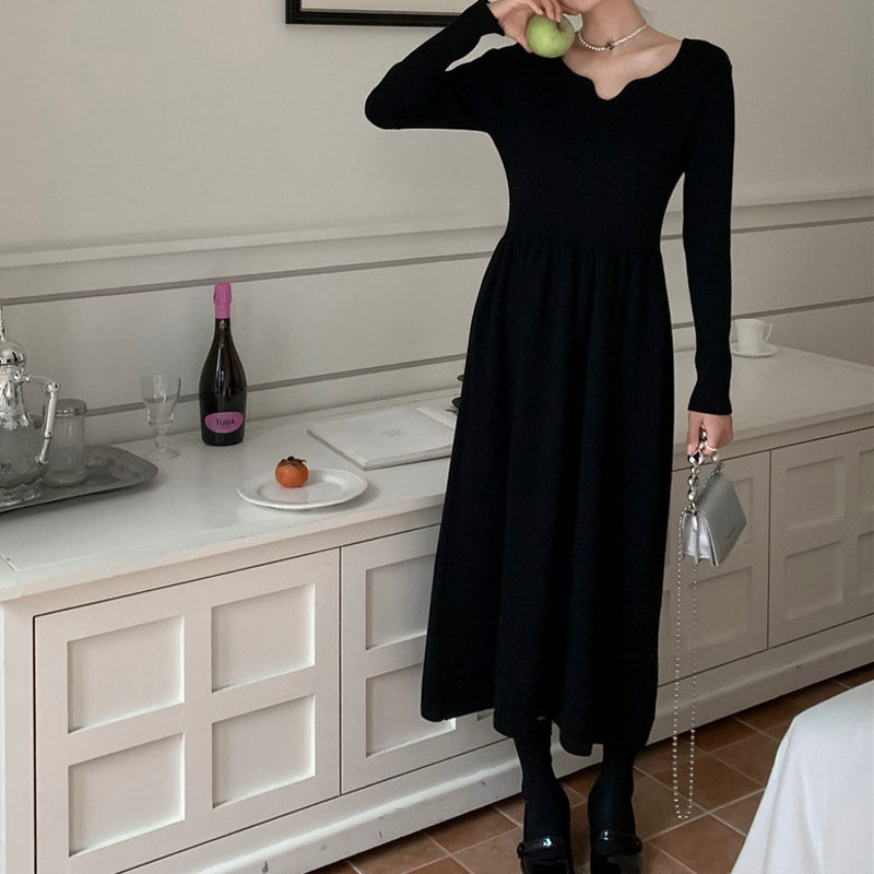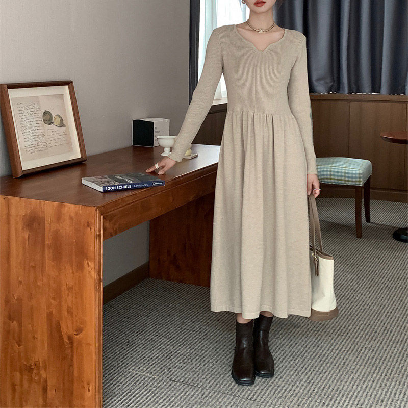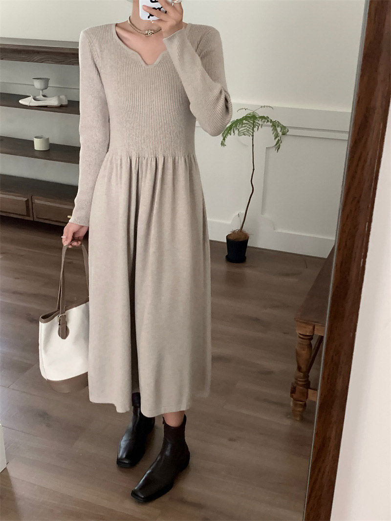 ニットワンピース ロング Vネック ワ レディースファッション 続々登場 モカベージュ ホワイト ブラック