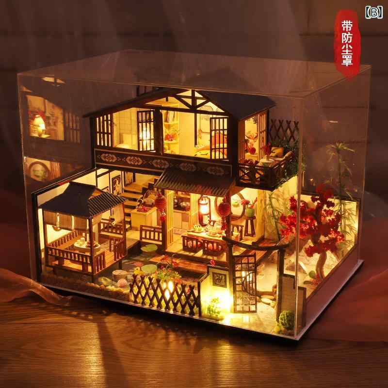 ミニチュアハウス DIY 手作り 組立式 木製 大邸宅 和風 レトロ ロフト 防塵カバー付き ドールハウス 模型 ジオラマ インテリア雑貨 大人向けホビー 建築モデル