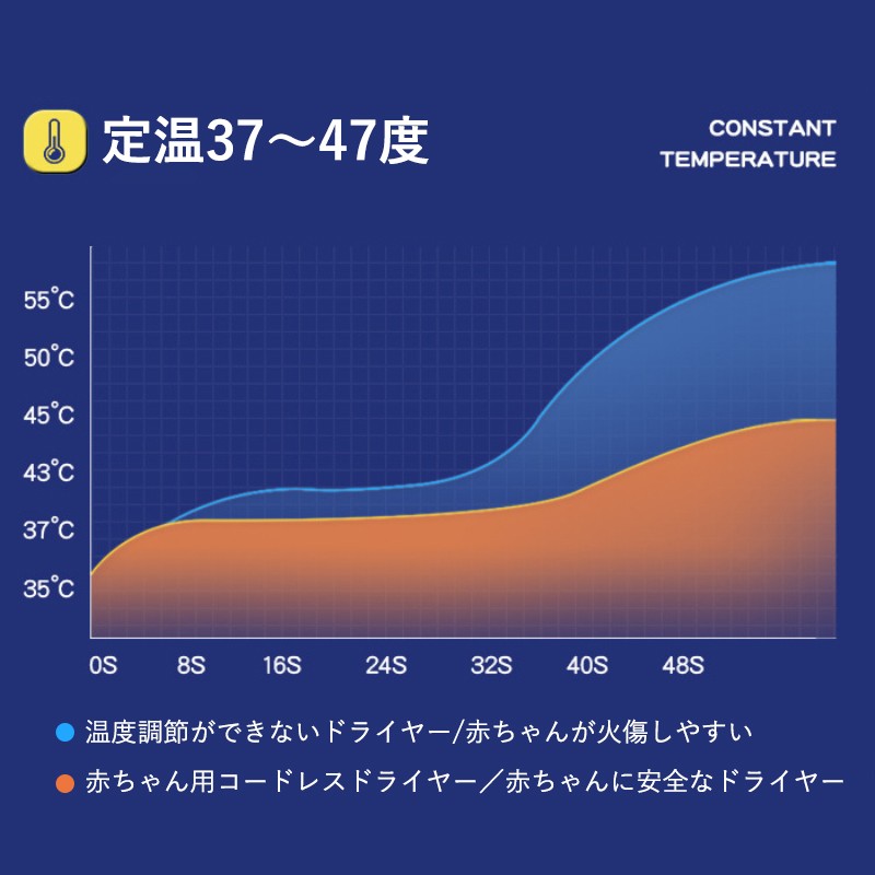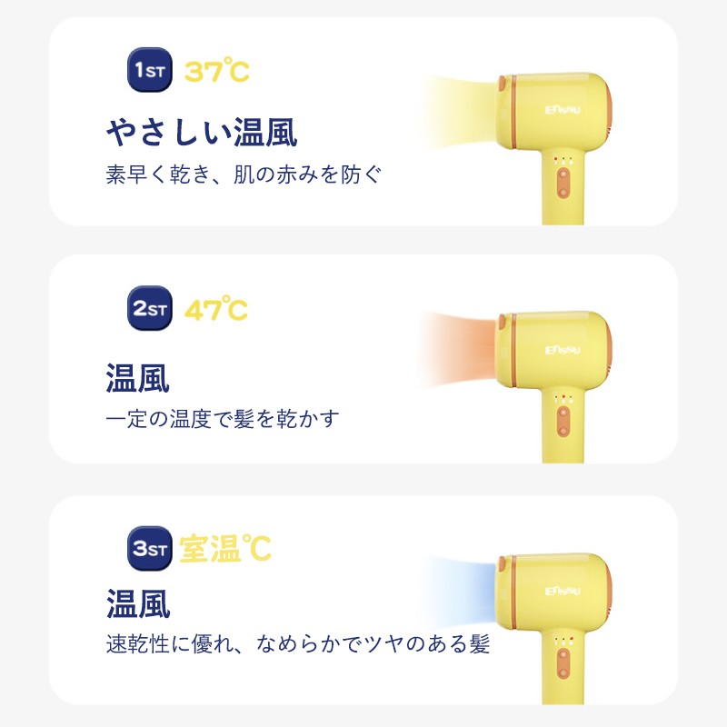 こどもや赤ちゃんの敏感なお肌に合わせた低温設計で、優しく乾かします。
