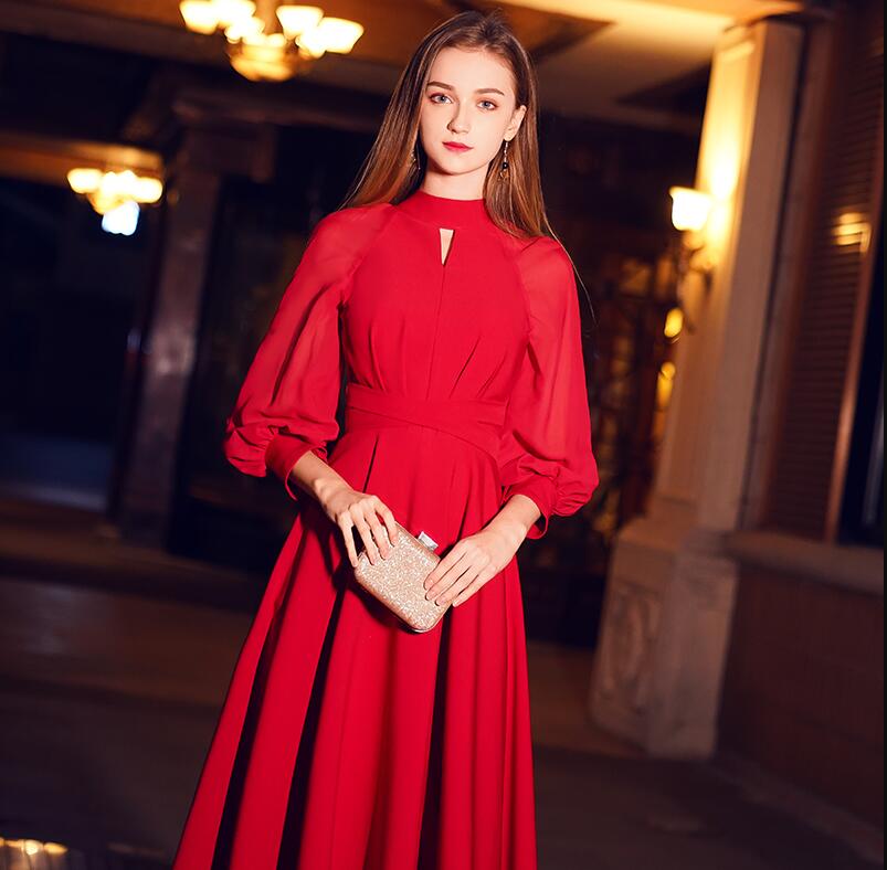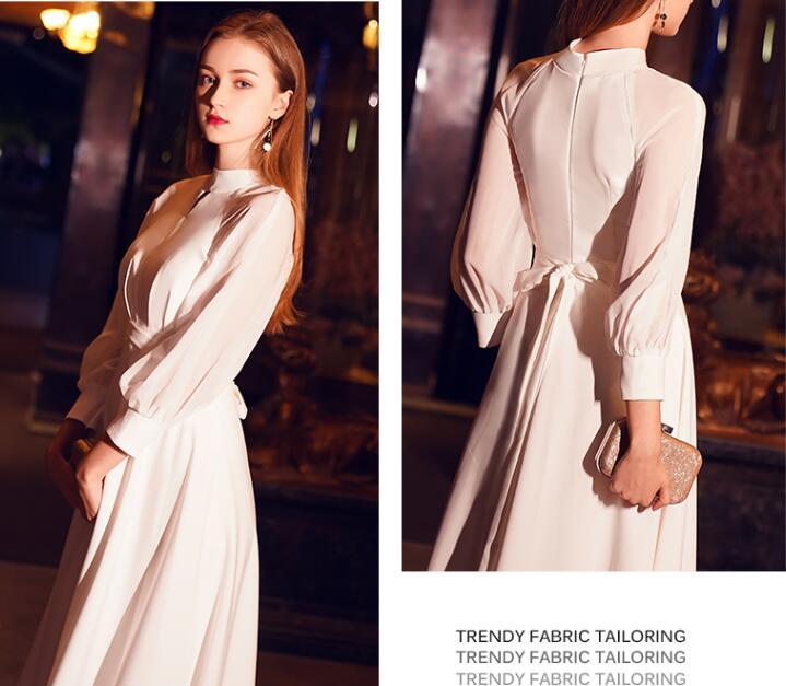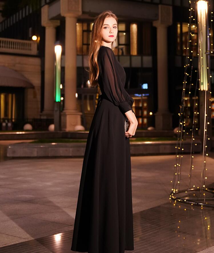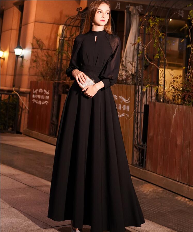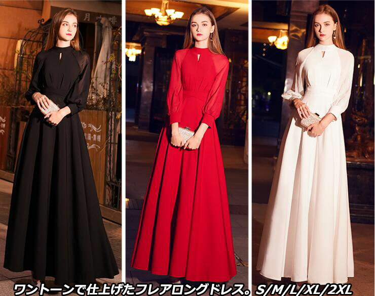 上品 3色 ウエディングドレス パーティードレス ロング 袖あり 長袖 ロングドレス 黒 袖付き スタンドカラー フォーマルワンピース 肌見せ 透け感 ボリュー シースルー