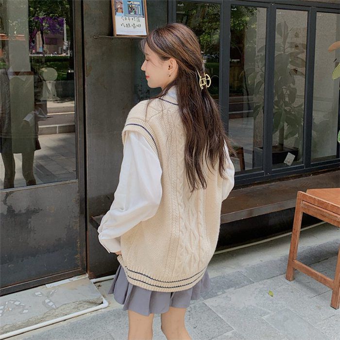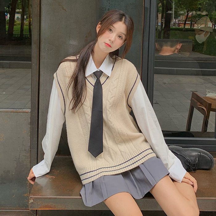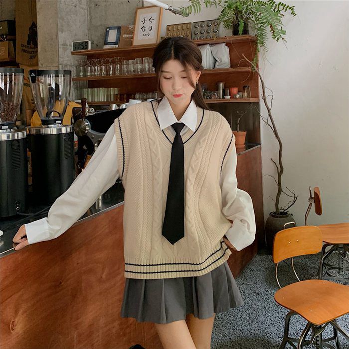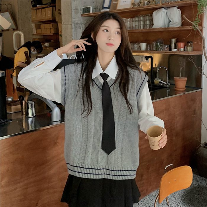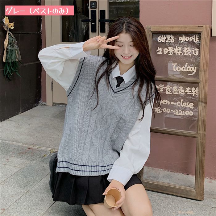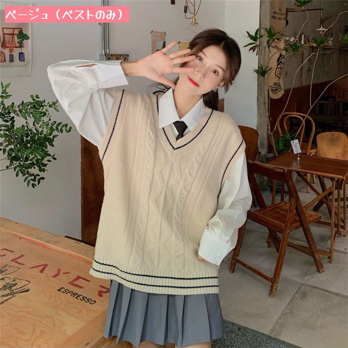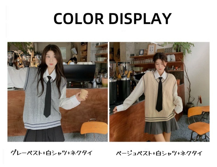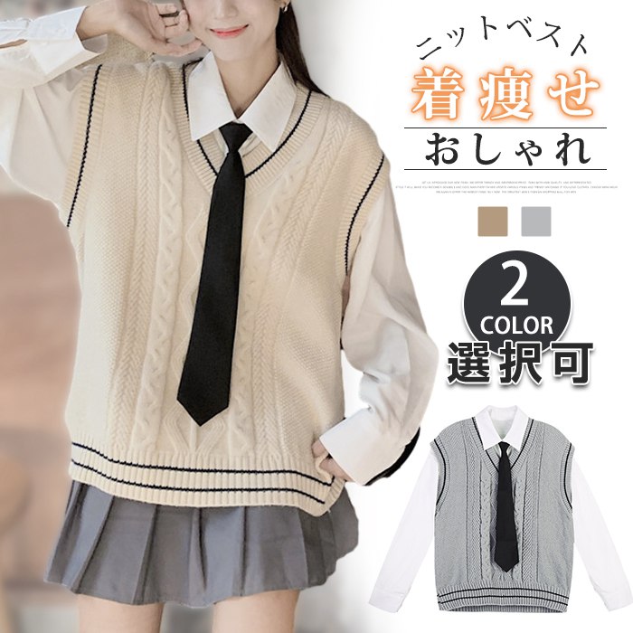ニットベスト レディース Vネック ネ レディースファッション 人気 白シャツ+ネクタイ グレー(ベストのみ) ベージュ(ベストのみ) グレーベスト+白シャツ+ネクタイ ベージュベスト+白シャツ+ネクタイ