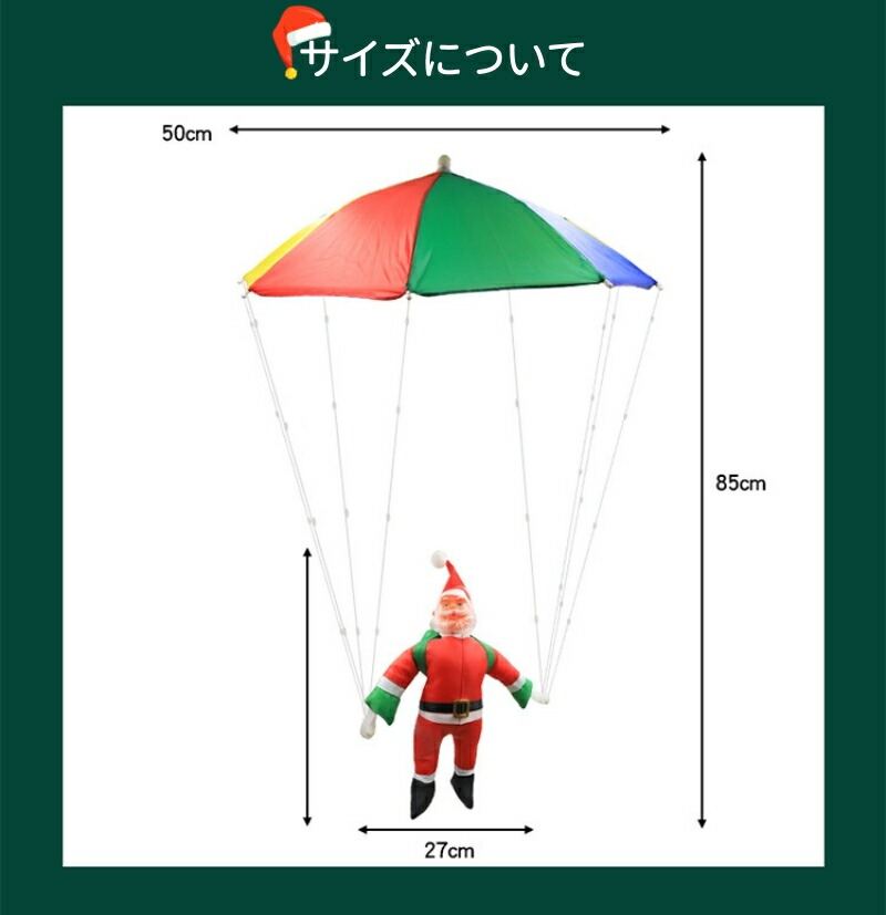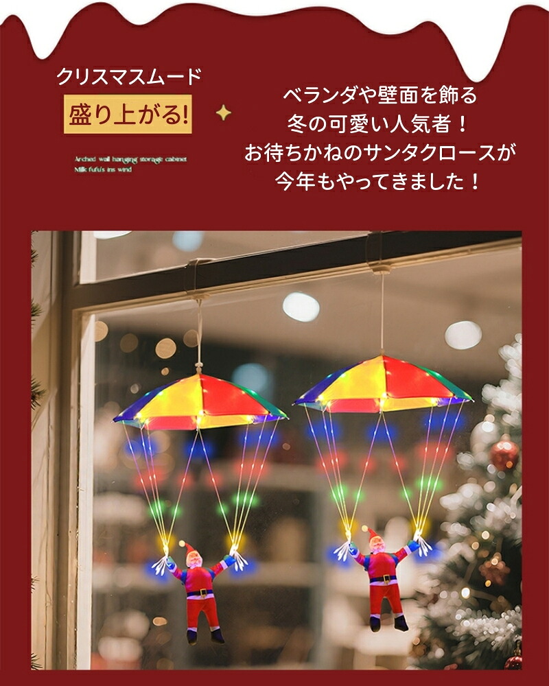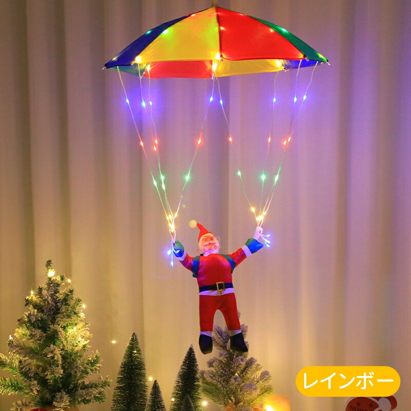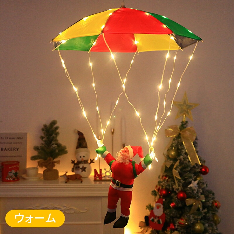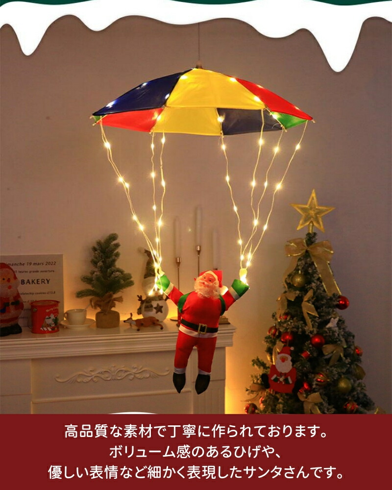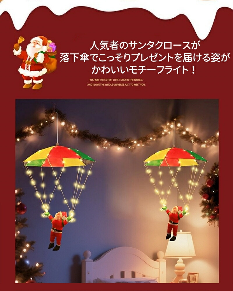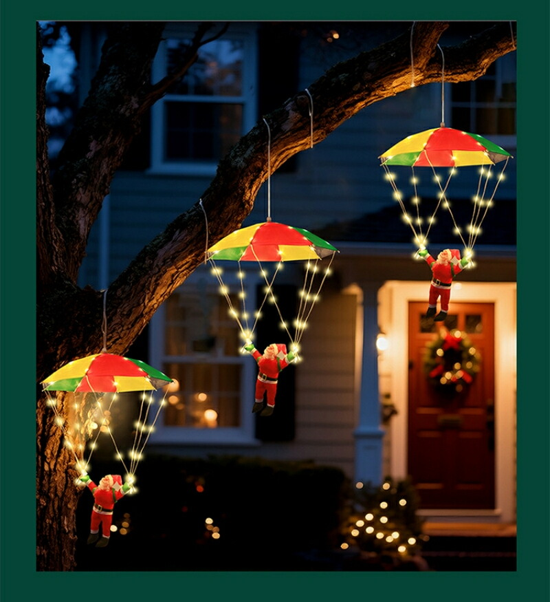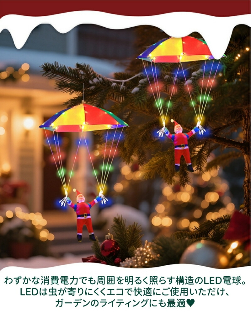 輝く落下傘が登るサンタさんが空から降りて、かわいいイルミネーションです。