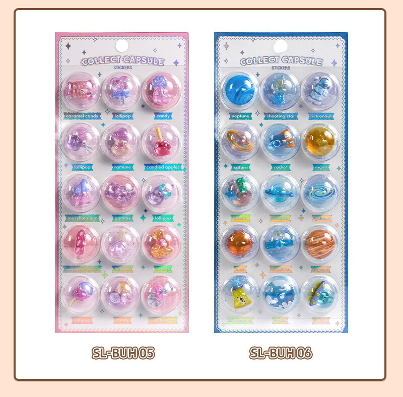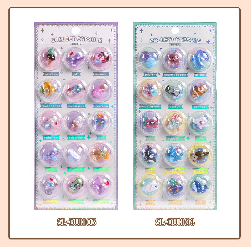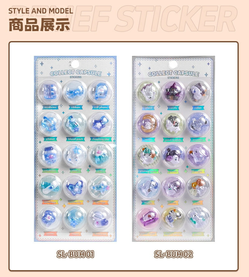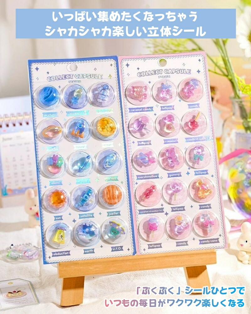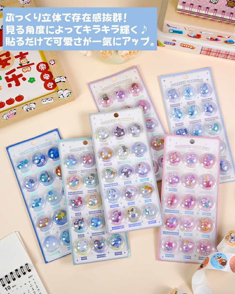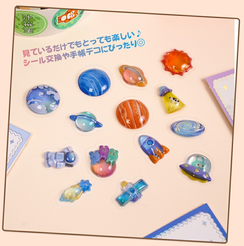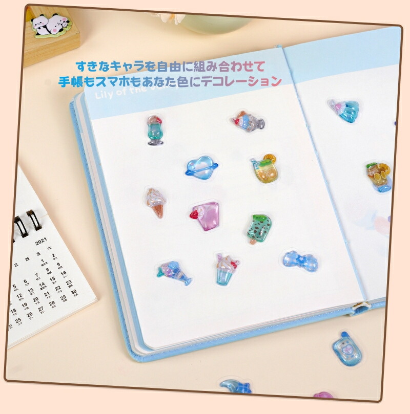 シールはドロップグルー素材で制作されており、光沢があり耐磨耗性にも優れます。さらに「ぷくぷく」と膨らんだ造型が特徴で、手帳に貼るとページに立体感を与え、水筒や鏡に貼っても水に強いため、装飾したい場所に自由に貼ることができ、見た目が良く実用的です。