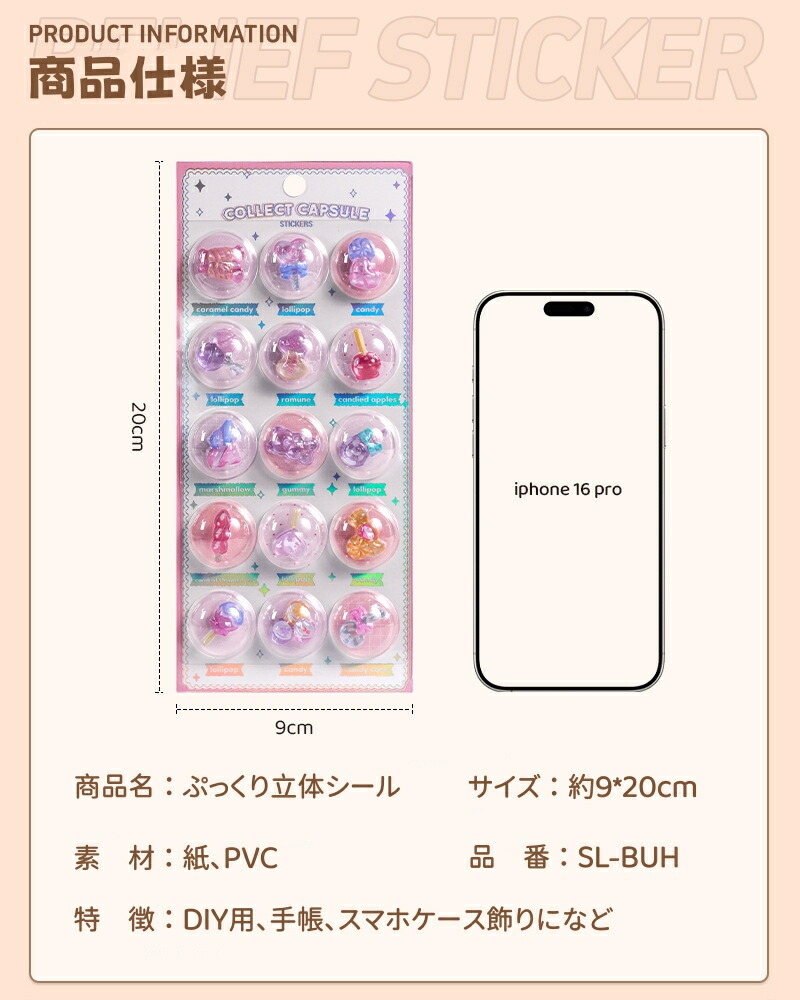 ぷっくり立体で存在感抜群! 見る角度によってキラキラ輝く♪ 貼るだけで可愛さが一気にアップします。
