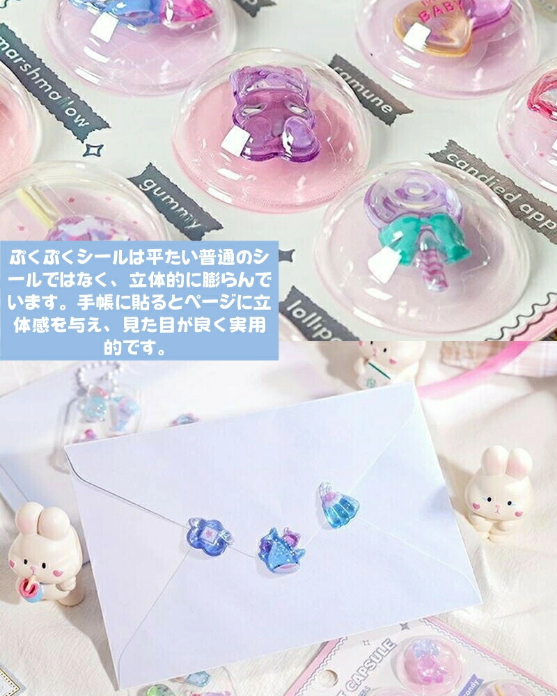 シールにはさまざまな可愛らしいカートゥーン柄がプリントされており、「ぷくぷく」と膨らんだ効果と組み合わせると、日記帳やプレゼントの包装に貼るだけで、子供っぽい可愛らしさが満点になります。