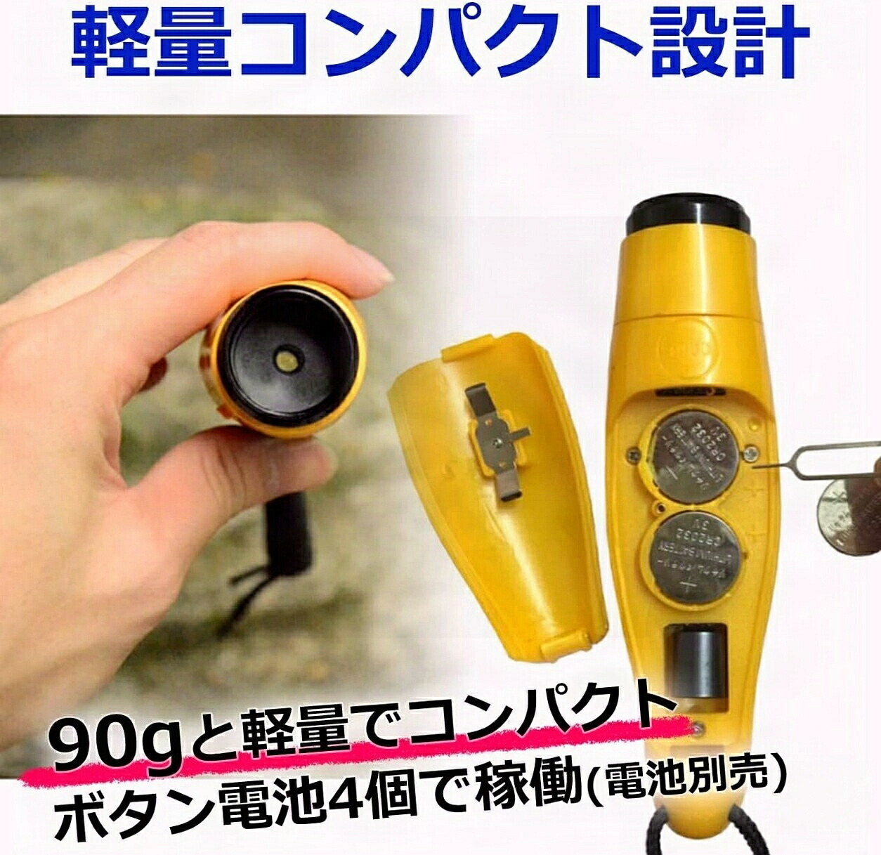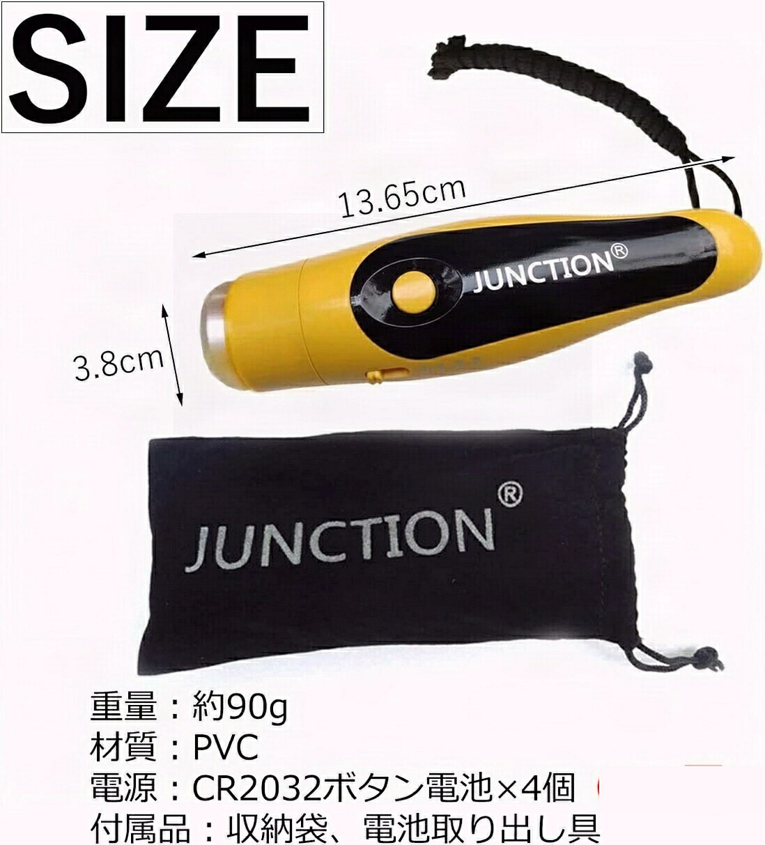 約3.8×13.65cm 重量:約90g 材質:PVC 電源:CR2032ボタン電池×4個(電池別売) カラー:イエロー 付属品:収納袋、電池取り出し具 ※モニターの環境により、色の見え方に若干差が生じる場合があります。