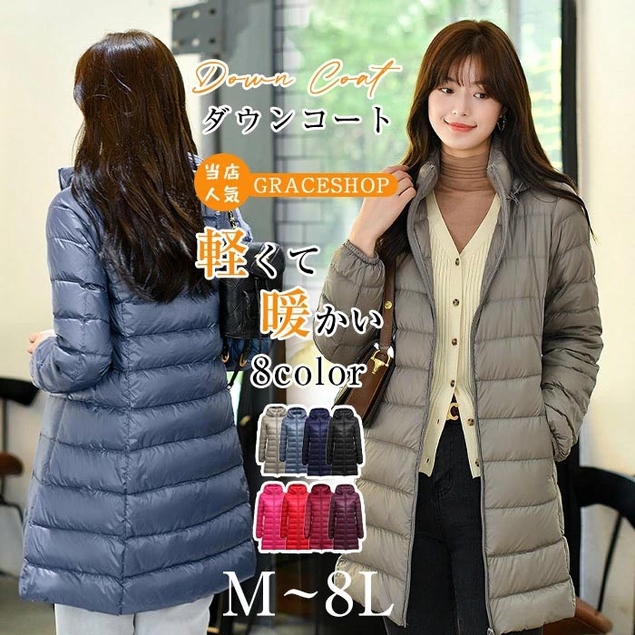 ライトダウンジャケット レディース ロング丈 ダウンコート ライトダウン 軽量 秋 冬 春 大きいサイズ M L LL 3L 4L 5L 6L 7L 8L ミドル丈 ライトアウター 薄型 ぽっちゃり