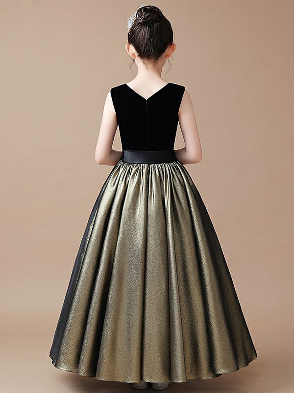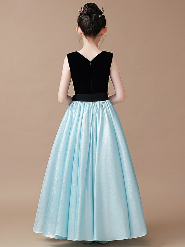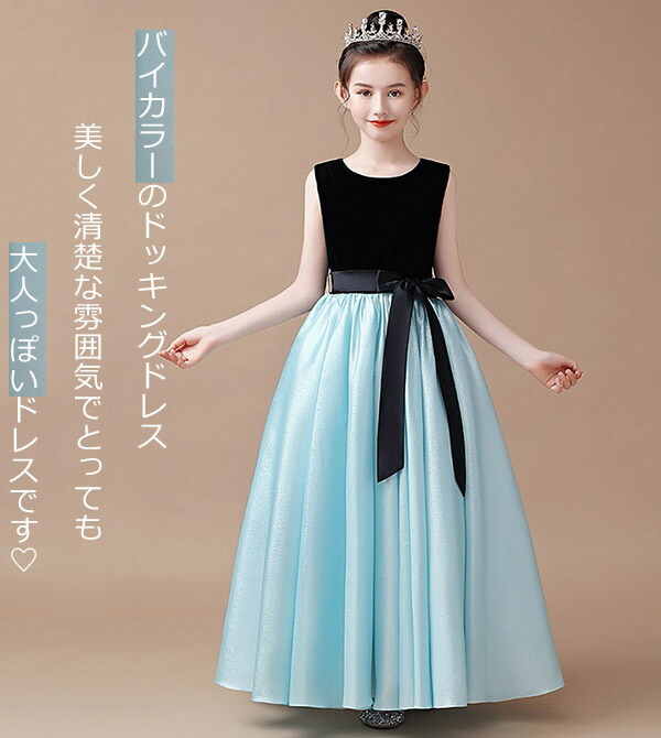 ピアノ発表会 ドレス 中学生 ワンピース ジュニアドレス 七五三 キッズドレス 子供ドレス ブルー ゴールド ドッキングドレス バイカラー 袖なし ノースリーブ ラメ入り 着やせ 上品 ロングドレス