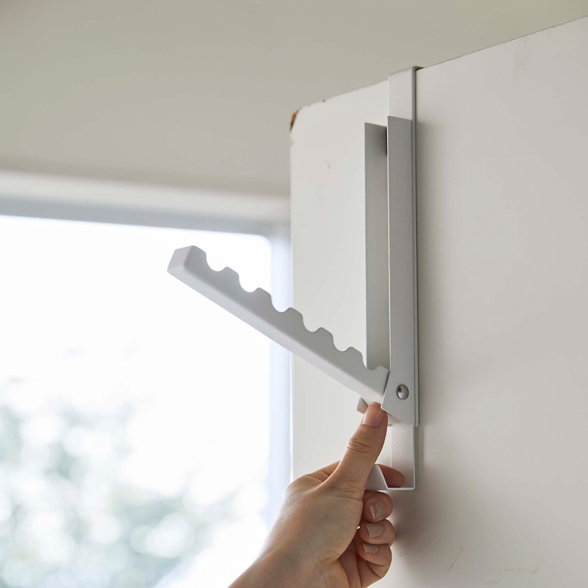使わない時はハンガー部分を折りたためばコンパクトに。収納時はマグネットでハンガー部が固定されるので、ドアの開閉時にパタパタ落ちる心配もありません。開く時は指で押すだけの簡単操作。