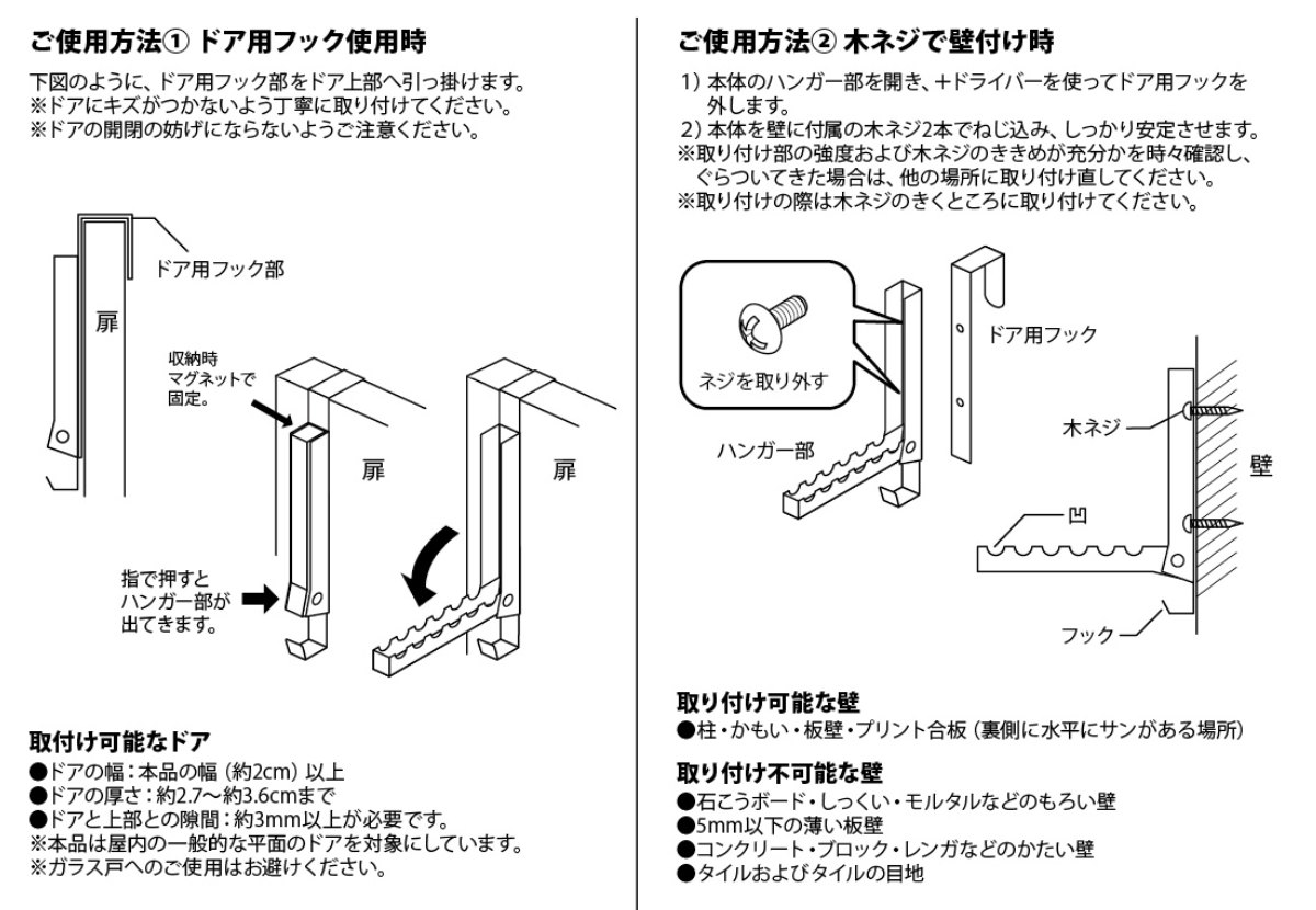 付属の木ネジで壁に取り付けることも可能。ドアがない場所やスライド扉でも、お好きな壁面に設置できます。
