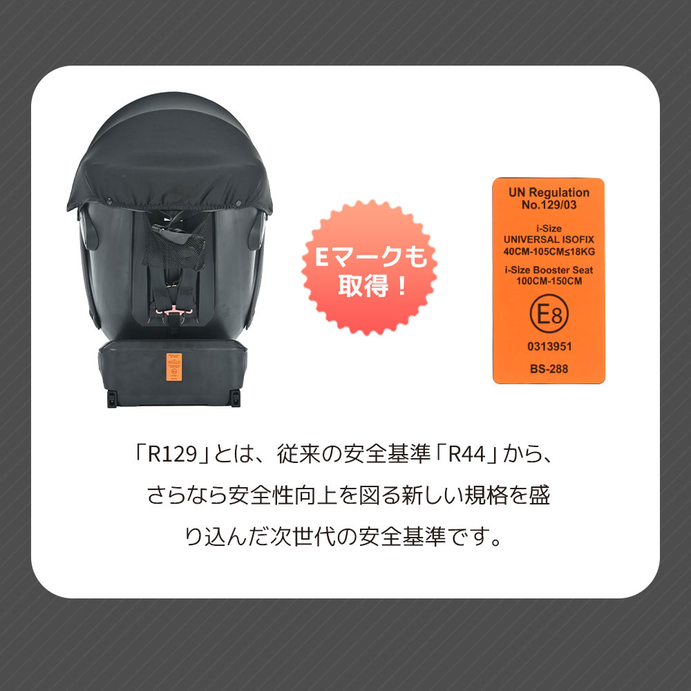 国土交通省公認・チャイルドシートの安全基準であるR129に合格済み。安心してお使いいただけます。