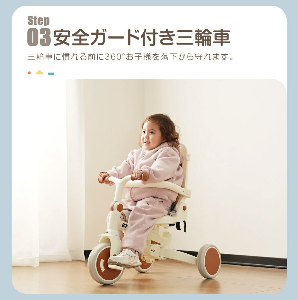 c.安全ガード付き三輪車:2~3歳 三輪車に慣れる前に360°お子様を落下から守れます。