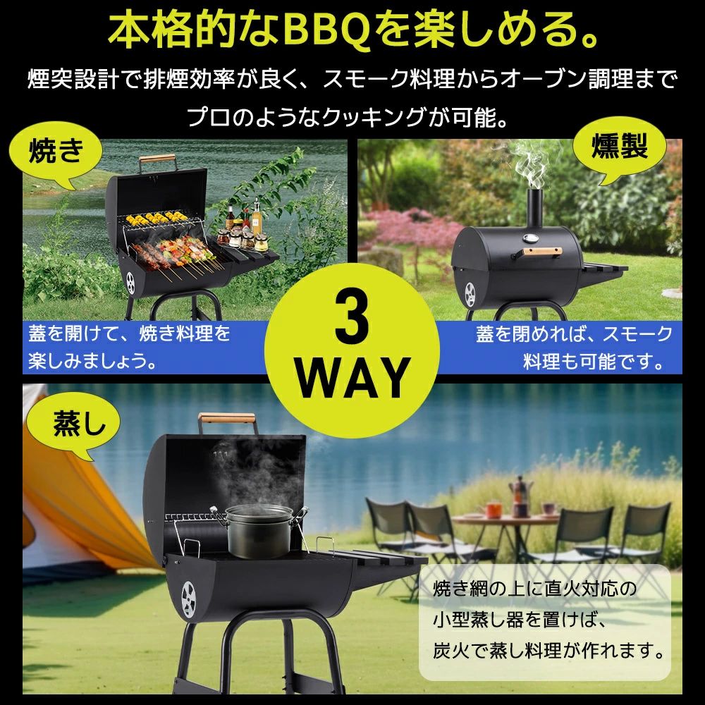 【3WAY】焼き:蓋を開けて、焼き料理を楽しみましょう。燻製:蓋を閉めれば、スモーク料理も可能です。蒸し:焼き網の上に直火対応の小型蒸し器を置けば、炭火で蒸し料理が作れます。ガーデンパーティーやキャンプ、屋外イベントにも最適です。