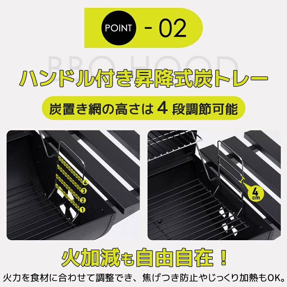 【ハンドル付き昇降式炭トレー】炭置き網の高さは4段調節可能火加減も自由自在!火力を食材に合わせて調整でき、焦げつき防止やじっくり加熱もOK。