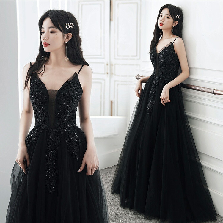 イブニングドレス 黒 発表会ドレス ロングドレス ノースリーブ キャミドレス ブラック Vネック セクシー パーティードレス ロング ビーズ 演奏会ドレス コンサート コンクール 二次会ドレス