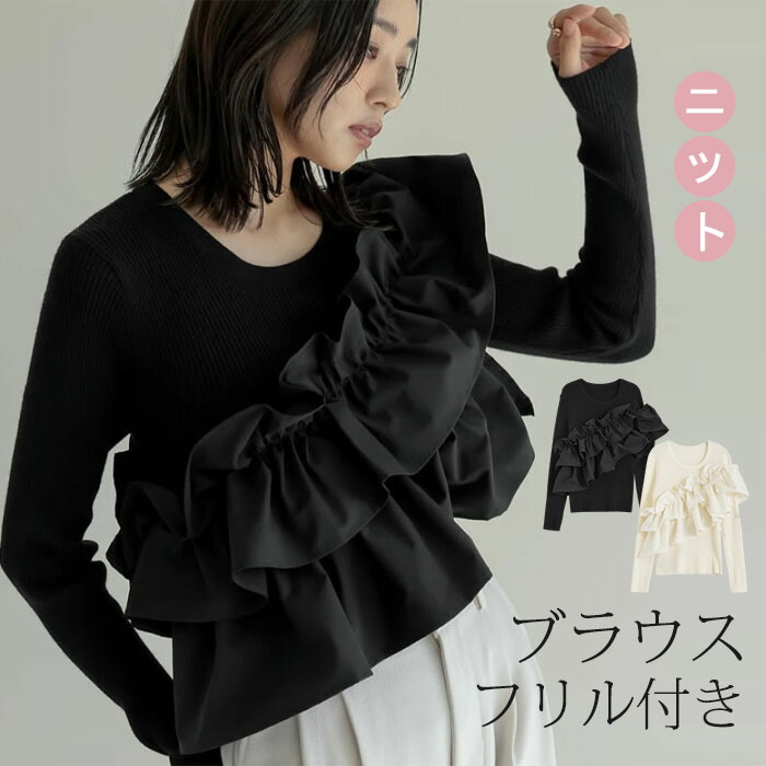 セーター フリル プルオーバー 春 秋 冬 レディース ニットブラウス 暖かめ レイヤード風 カットソー ゆったり 大きいサイズ チュールドッキングカットソー チュール飾り 長 トレンド