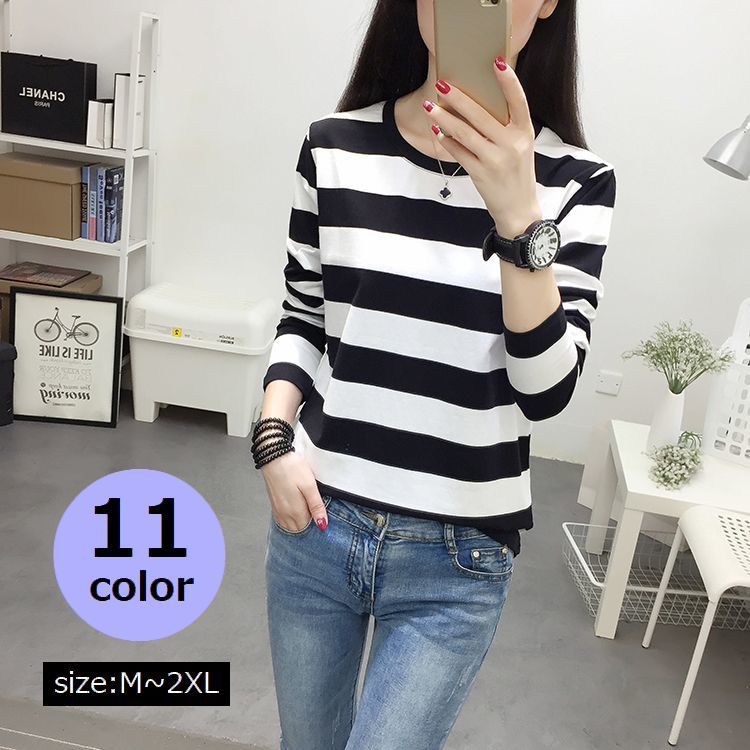 【3点15%offクーポン配布中 カットソー レディース 女性 ス Tシャツ 長袖 ボーダー Uネック 春秋 春服 秋服 カジュアル シンプル かわいい カラバリ豊富 ブラック ホワイト おしゃれ