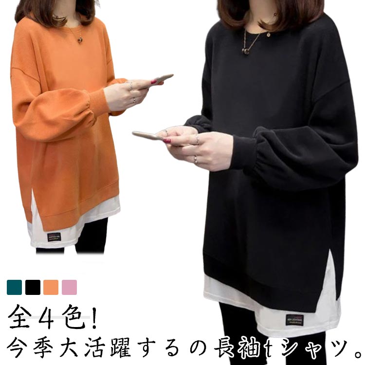 ロングT トレーナー 春服 重ね着風 ロング丈 大きサイズ Tシャツ レディース 長袖 秋服 ゆったり ラウンドネック トップス