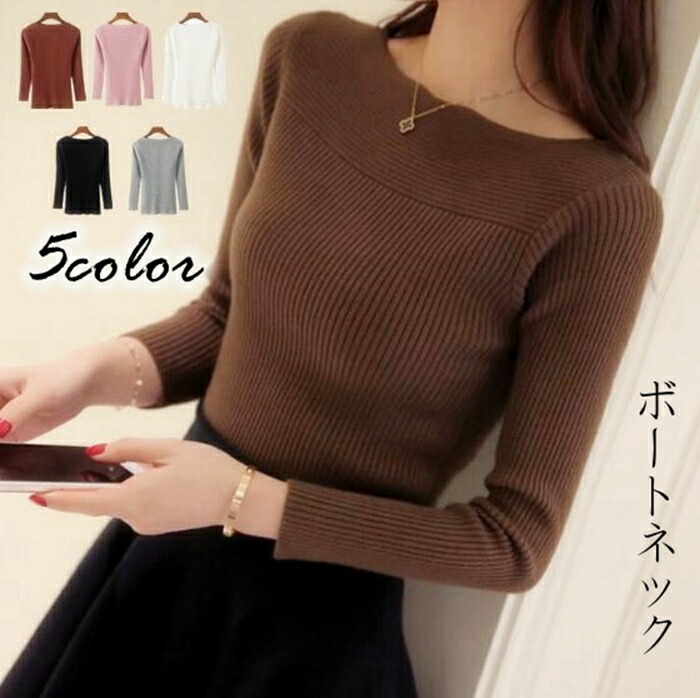 ニット ボートネック リブ編み タイト レデイース セーター シンプル インナー リブ ネック 秋 春 冬 新作 3