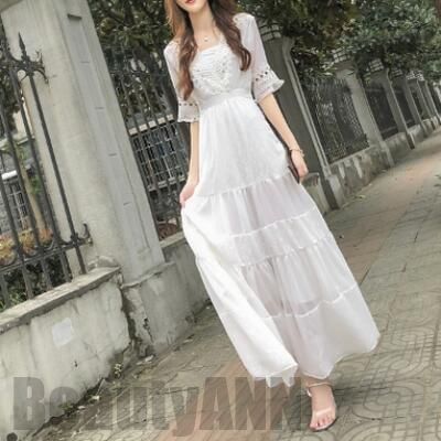 白 ワンピース 袖あり マキシ丈 ロング丈 エレガント 夏 半袖 お