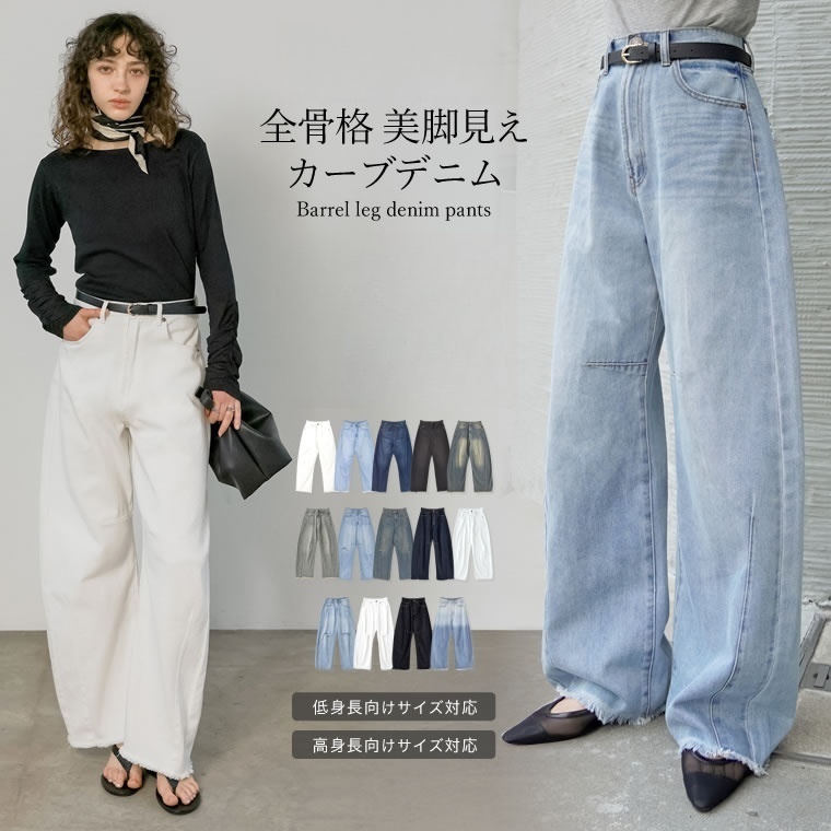 【全9サイズ展開】カーブデニム 再販開始!フリンジ×バレルレッグが可愛いカーブデニム|低身長から高身長まで、立体的カーブが脚をきれいに見せるカバーパンツ