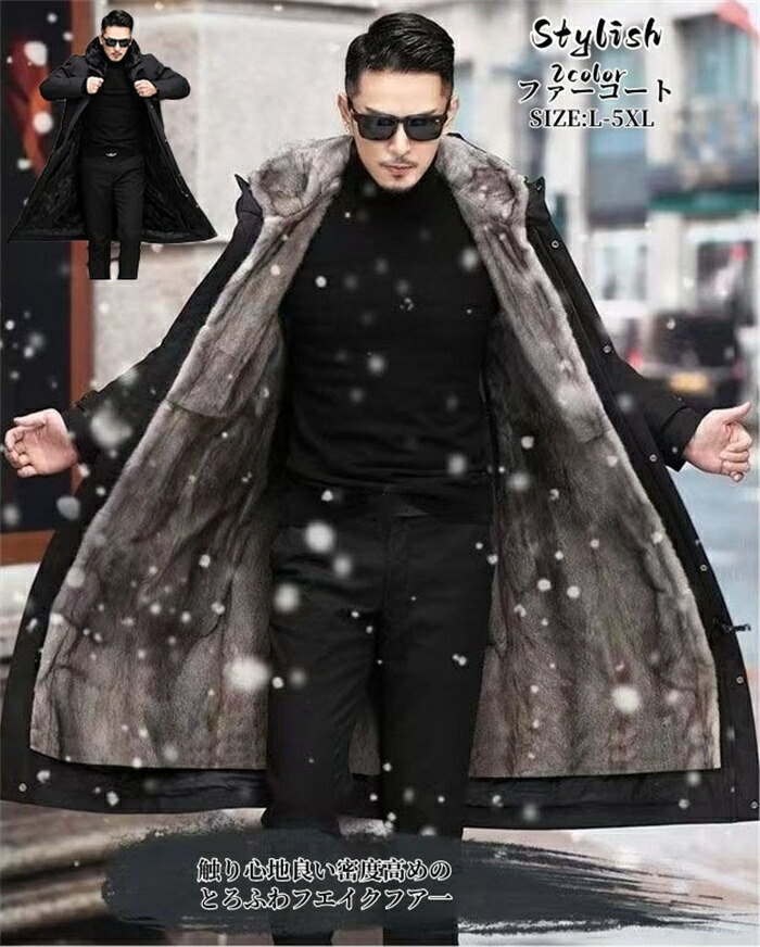 フェイクファー コート メンズ ダウンジャケット ロング丈コート 秋冬 長袖 アウター 暖かい 防風 防寒着 大きいサイズ フード付き カジュアル お洒落 プリングコート 防風防寒 毛 紳士用