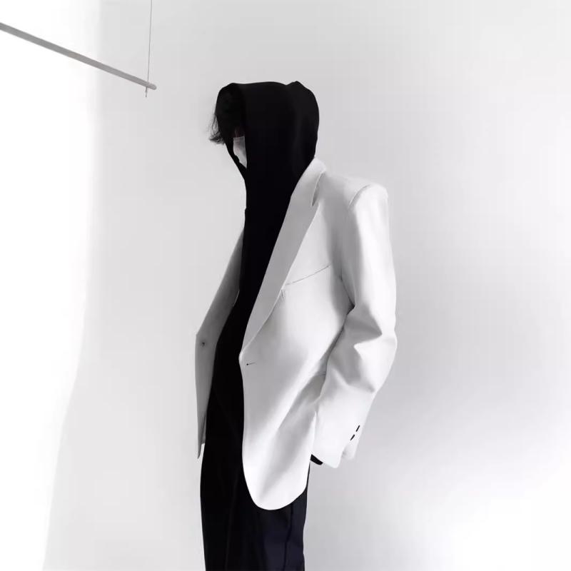 ジャケット メンズ 高級感 クール スタイリッシュ 韓国風 ピークドラペル パッド入り シングルブレスト ホワイト ゆったり ドレープ感 長袖 シワになりにくい デイリーユース ポリエステル