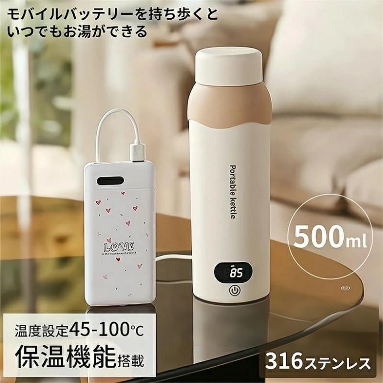 ポータブル電気ケトル 電気水筒 電気ケトル 電気ポット 500 小型 ミニ 電気ボトル 魔法瓶ポット 保温瓶 コンパクトサイズ ポータブルケトル オープン 4段階温度設定 大容量 アウトド やかん