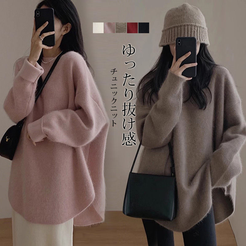 ニット セーター 長袖 レディース トップス ニットトップス 秋冬 丸首 クルーネック ラウンドヘム プルオーバー チュニック ニットセーター オーバーサイズ ドロップショルダー もこも 大きいサイズ