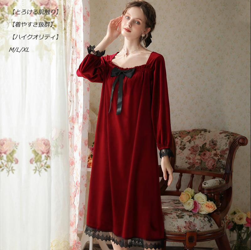 ネグリジェ 寝巻き ルームワンピース ナイトウエア 長袖 宮廷お姫系 シフォンドレス パジャマ キャミワンピース ランジェリー 秋冬用 ロング丈 長袖 ベルベット ビロード