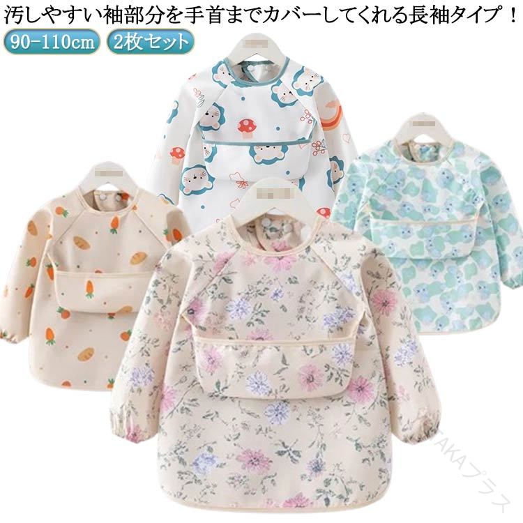 ベビーエプロン 食事用エプロン お食事エプロン 2枚セット 保育園 離乳食 ポケット付き 防水 袖付きスモック ロング おしゃれな食事スタイ 男の子 女の子 食べこぼし防止 長袖 子供用 入園準備対応