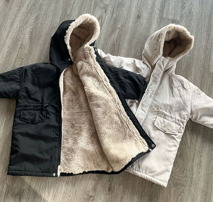 暖かく快適な裏ボア仕様の子供用ベンチコート風パーカー冬服 男の子女の子兼用カジュアル厚手中綿で防風効果抜群