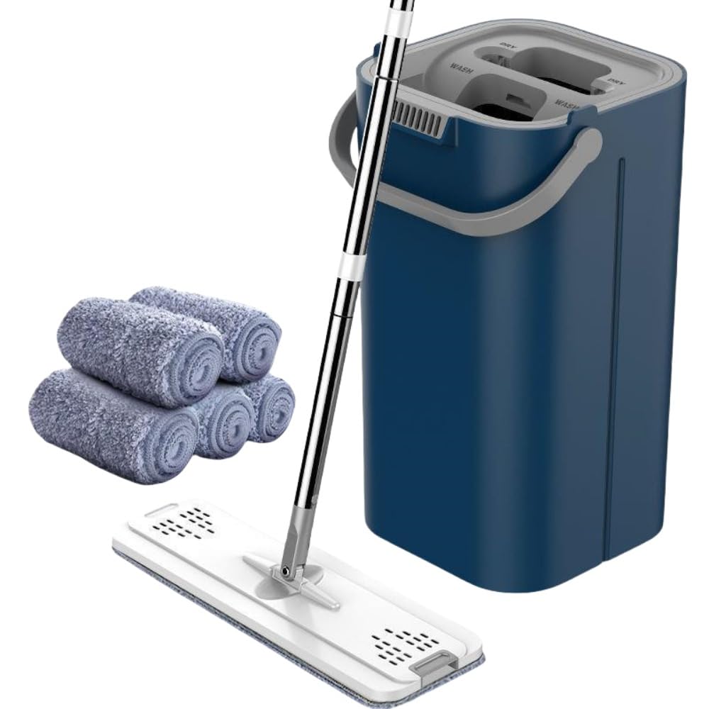 モップとバケツ 絞り器セット ハンズフリー フラットフロアモップとバケツ 乾湿両用 床掃除システム 洗えるマイクロファイバーパッド付き