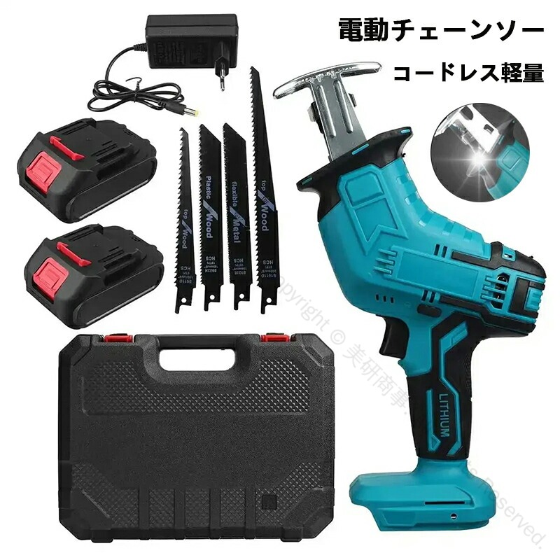 21の高性能充電式電動ノコギリ 小型チェンソー 軽量で女性にも扱いやすく 金工木工の高速切断に最適 ブレード4本付属