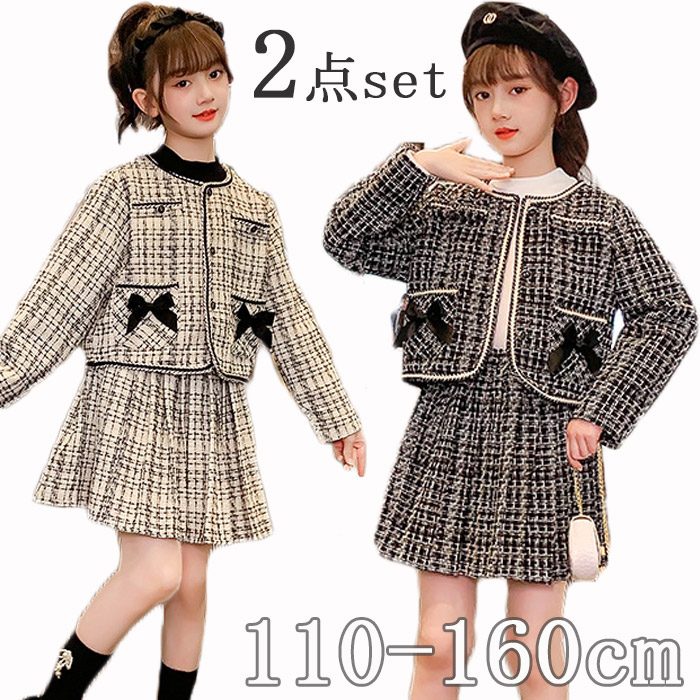 子供スーツ 女の子 セットアップ 上下セット 冬服 厚さ フォーマルスーツ 子供服 ツイードスーツ ジャケット スカート シュート丈 チェック柄 可愛い お洒落 入園式 入学式 卒園式 キッズ