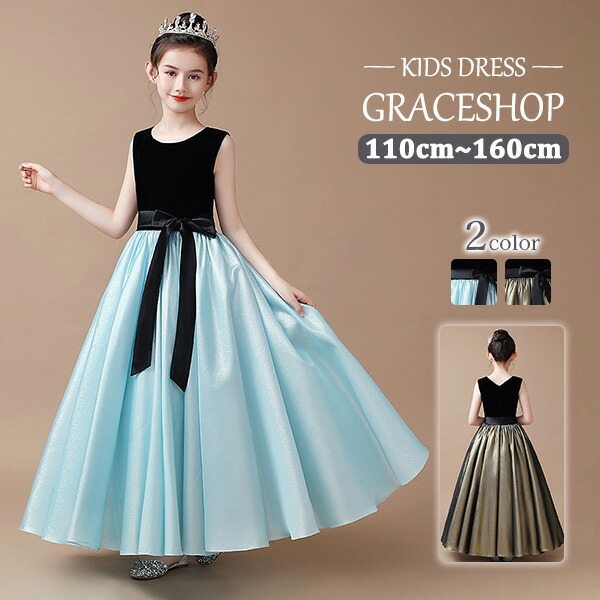 ピアノ発表会 ドレス 中学生 ワンピース ジュニアドレス 七五三 キッズドレス 子供ドレス ブルー ゴールド ドッキングドレス バイカラー 袖なし ノースリーブ ラメ入り 着やせ 上品 ロングドレス