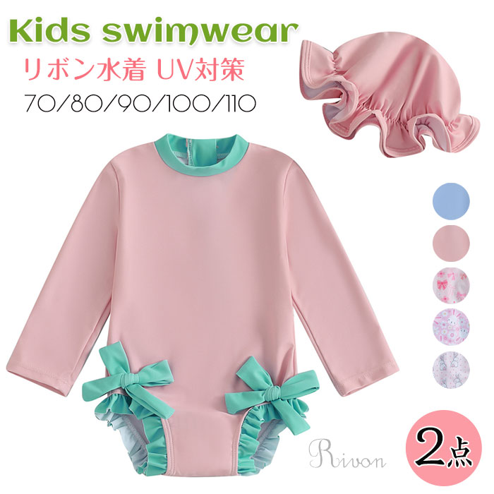 ベビー水着 キャップ付き ロンパース 水着 長袖 保育園 ラッシュガード スイムウェア 一体型 ワンピース 女の子 キッズ水着 子供水着 リボン UVカット 日焼け防 フリル