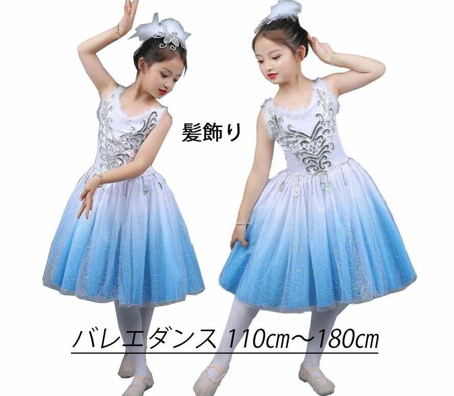 ふんわり 膝丈ワンピース モダンドレス スパンコール グラデーション 白青 バレエドレス 女の子 ダンス衣装 バレエ 子供 キッズ