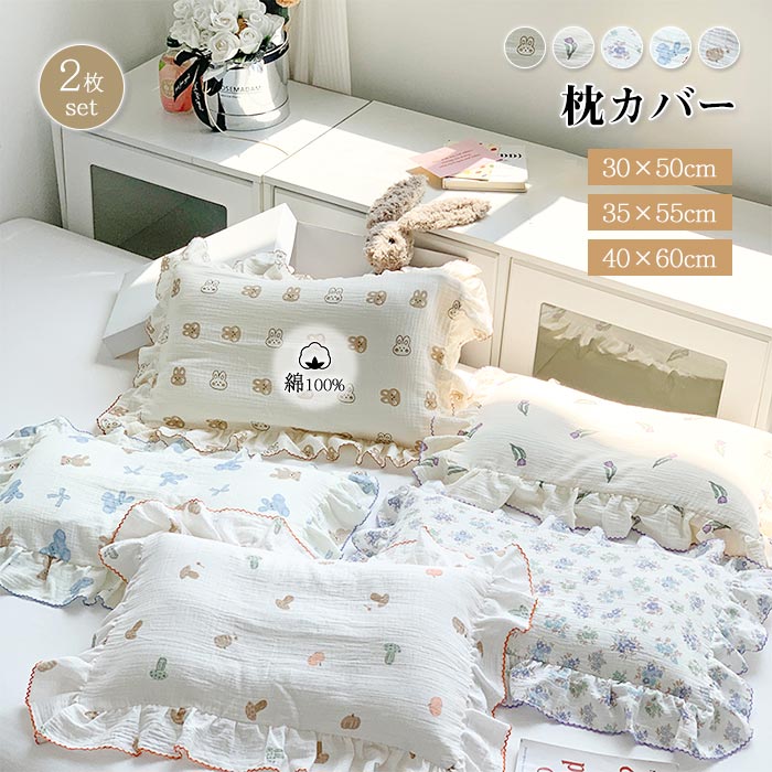 枕カバー 綿100% おしゃれ 無地 花柄 枕パッド 柔らかい まくらカバー 可愛いフリル付き 2枚組 家庭用枕カバー 寝具 30×50cm 35×55cm 40×60cm インテリア